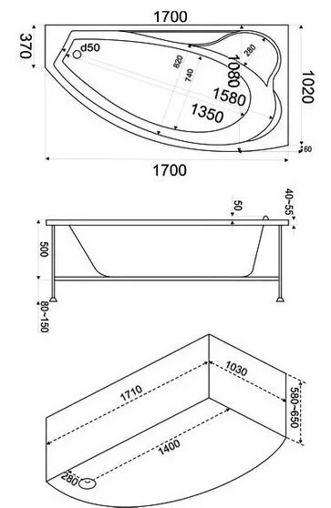 Ванна оборудована подголовником и сиденьем, которое можно использовать в качестве полки. В комплект дополнительно включен металлический каркас с ножками, регулируемыми по высоте от 8 до 15 сантиметров. Объем чаши составляет 290 литров.