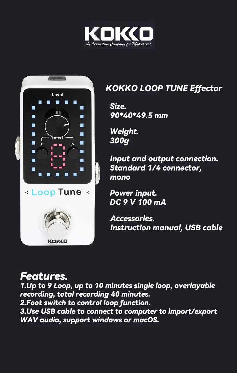 7. Один ножного переключателя управления: запись, воспроизведение, overdub, отменить, повторить, стоп-сигнал, удалить.