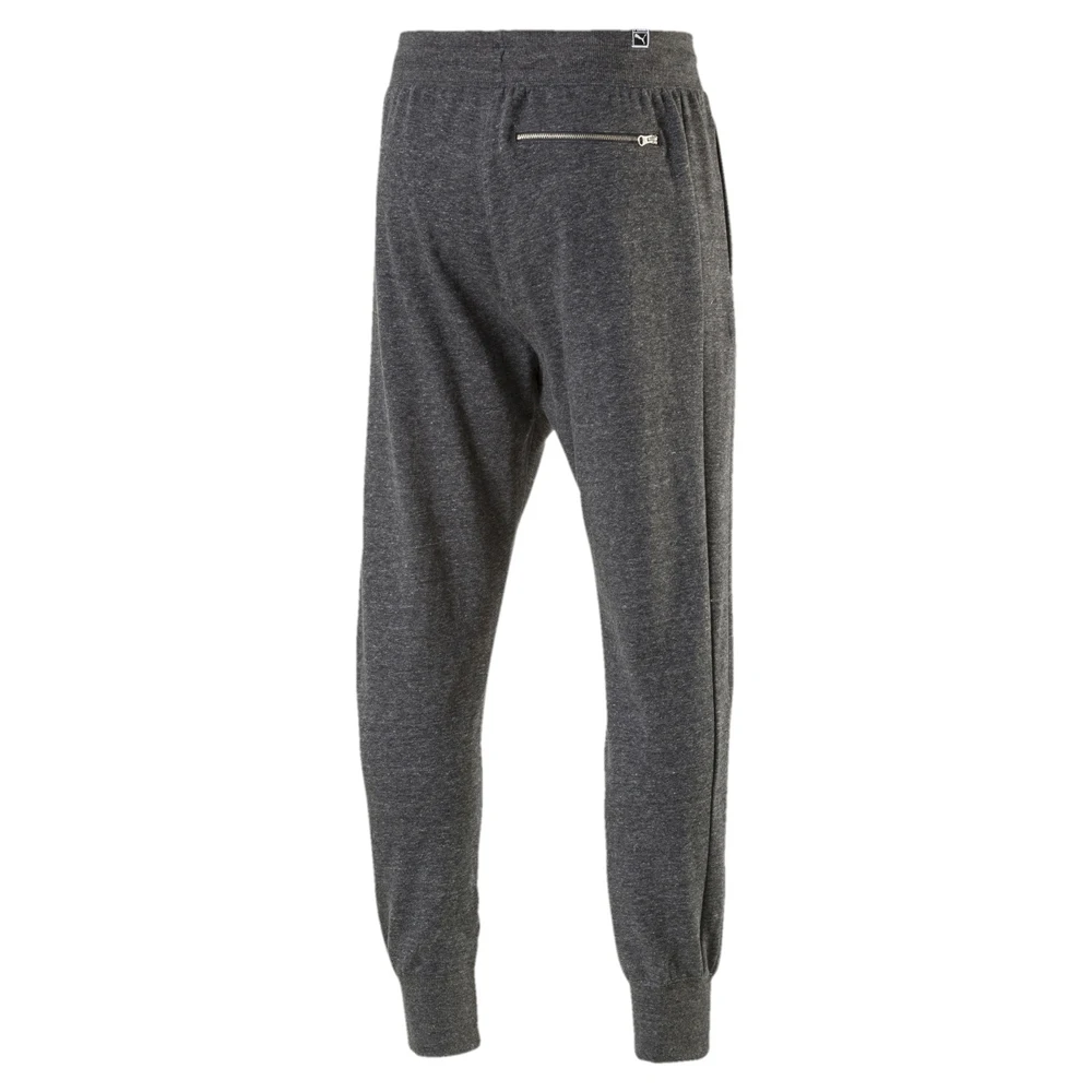 Спортивные брюки декорированы вышитым логотипом с деталями из замши, а также имеют ярлык с логотипом PUMA. Фирменный крой подчеркнут широкими лампасами. Спереди в шве и сзади имеются удобные карманы с обтачками из основного материала изделия, снабженные скрытыми застежками-молниями, а карман у пояса выполнен из эластичного материала. Манжеты внизу штанин выполнены из эластичного трикотажа в резинку. Брюки имеют заниженную талию и посадку в обтяжку по фигуре.