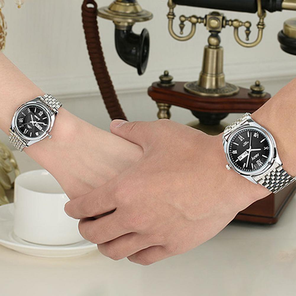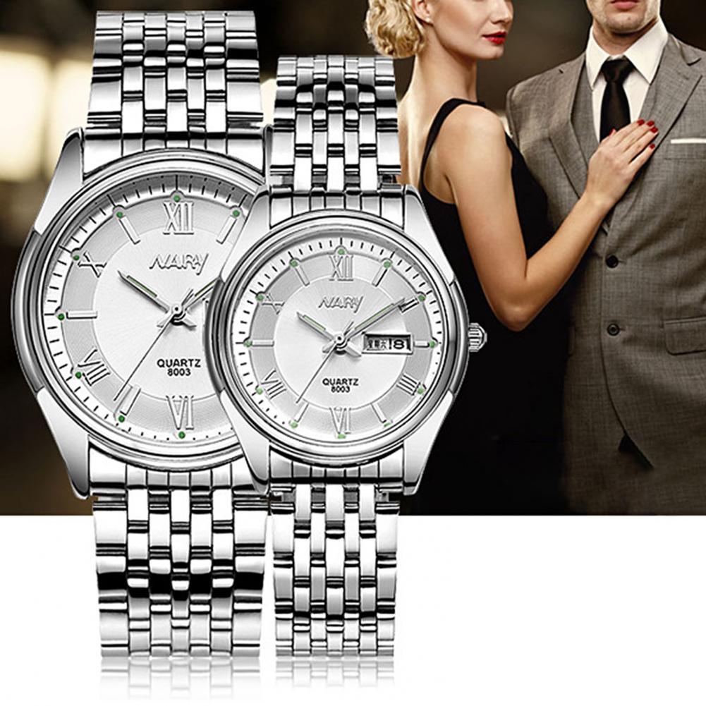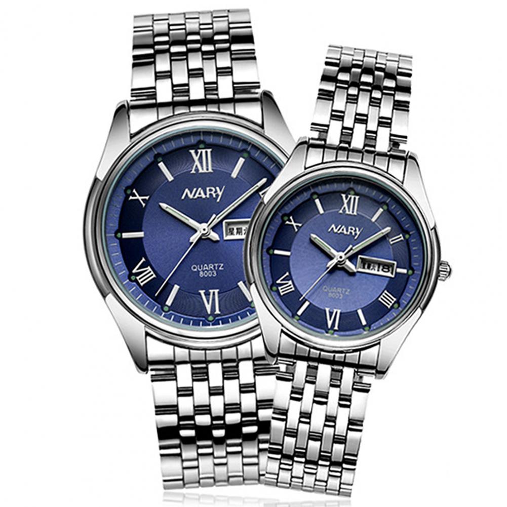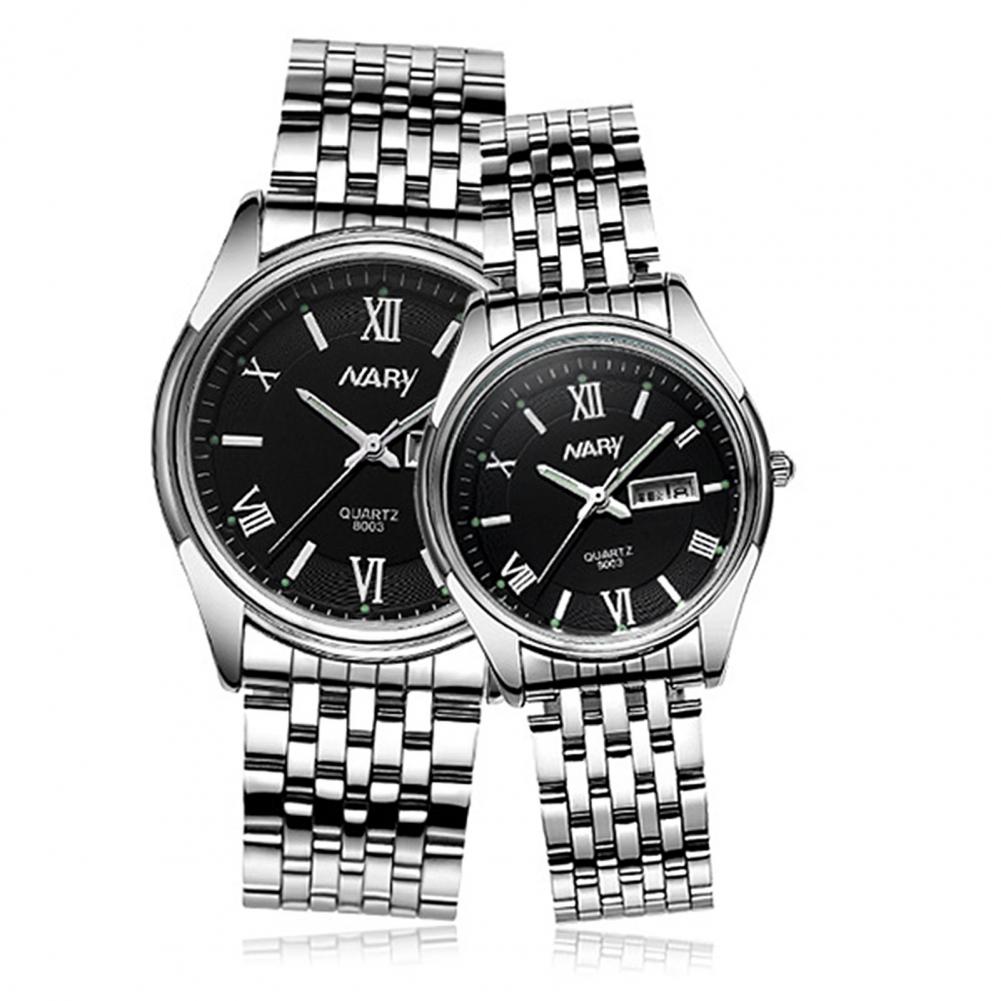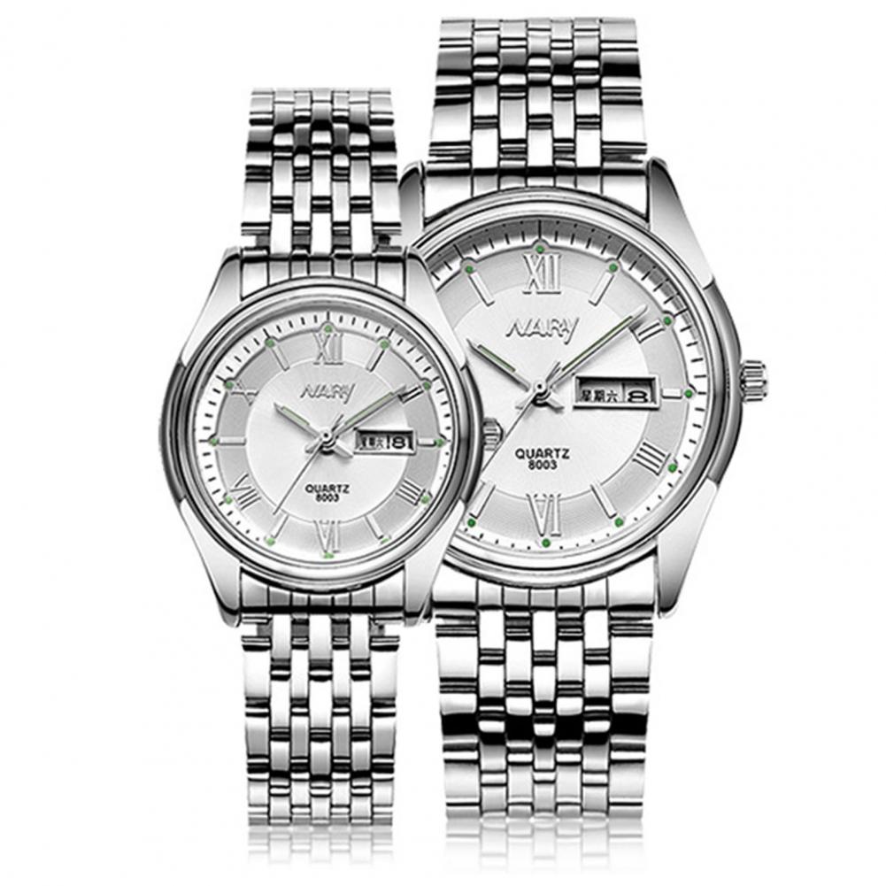 8003 пара часов Неделя Календарь простой нержавеющей стали водонепроницаемые кварцевые наручные часы для отпуска