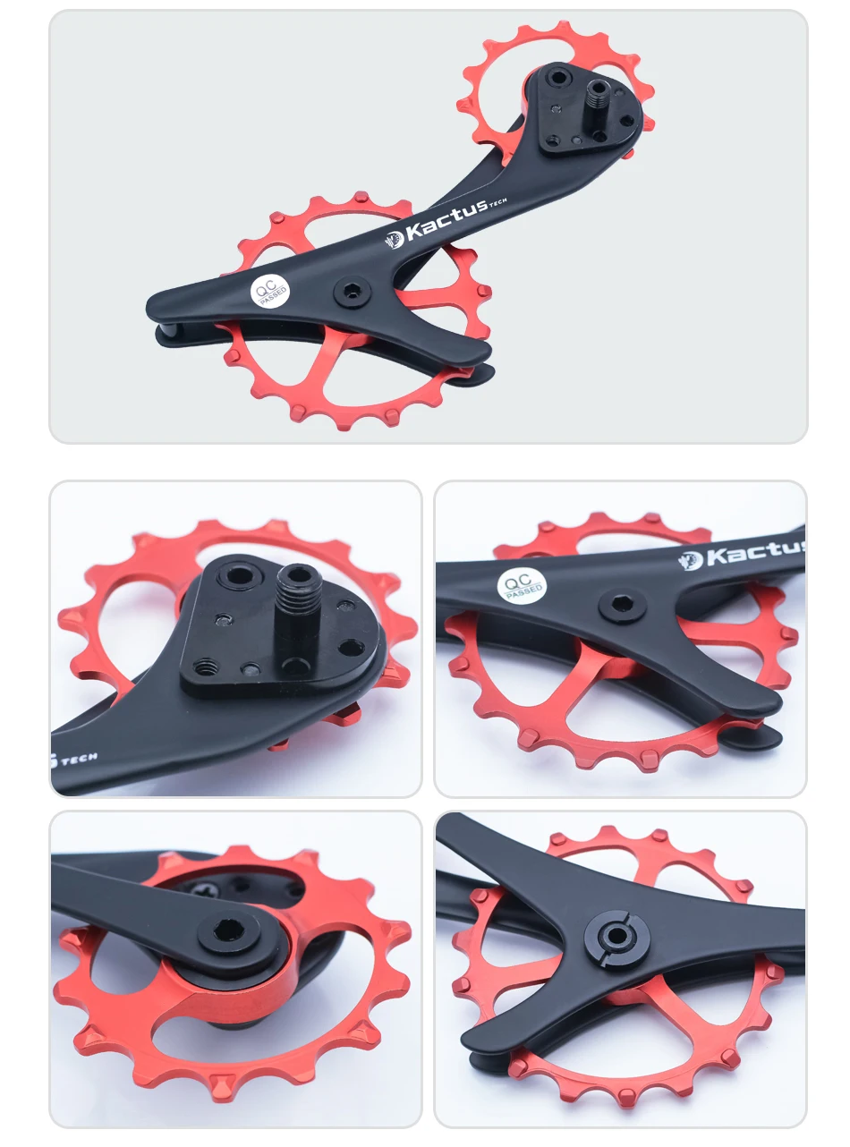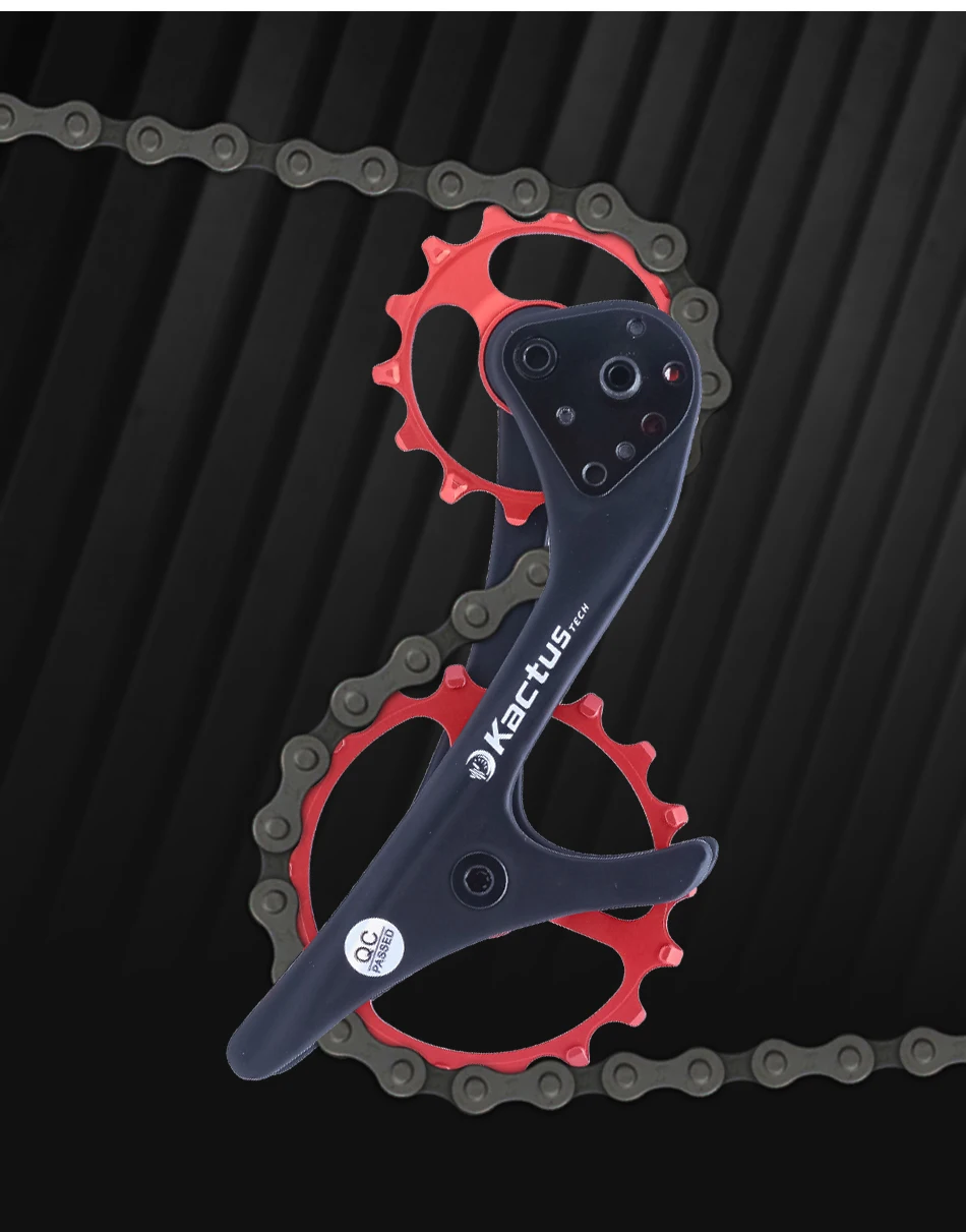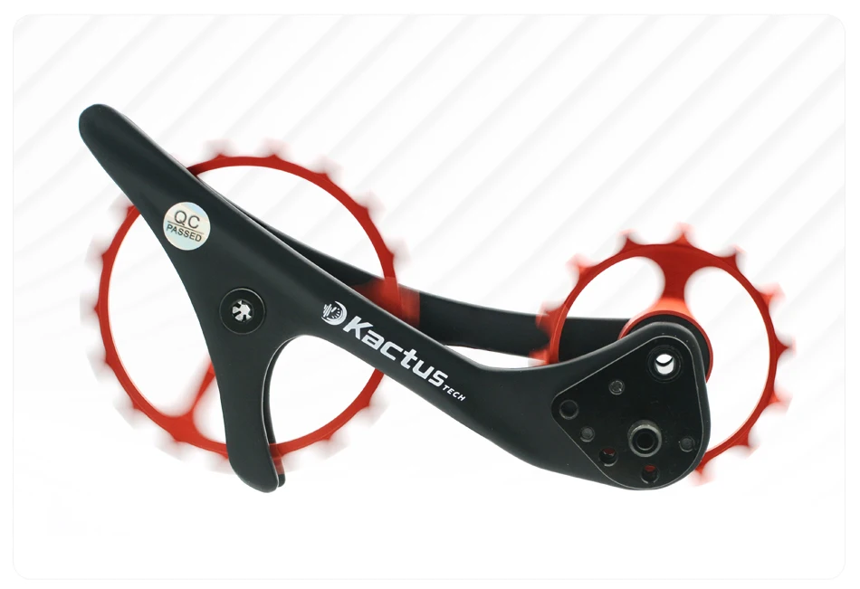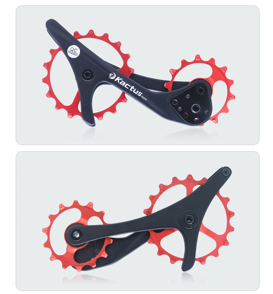 5-е преимущество: для серии Shimano MTB, верхний шкив реализует Оптимизированный дизайн 14t lotus, с более сложным углом кривой и формой зуба, предотвращение аномального движения цепи во время переключения, который обычно обнаруживается в модификациях расширения кассеты, т. Е. 46T до 50T, что приводит к понижению шума и трению и более быстрому плавному переключению.