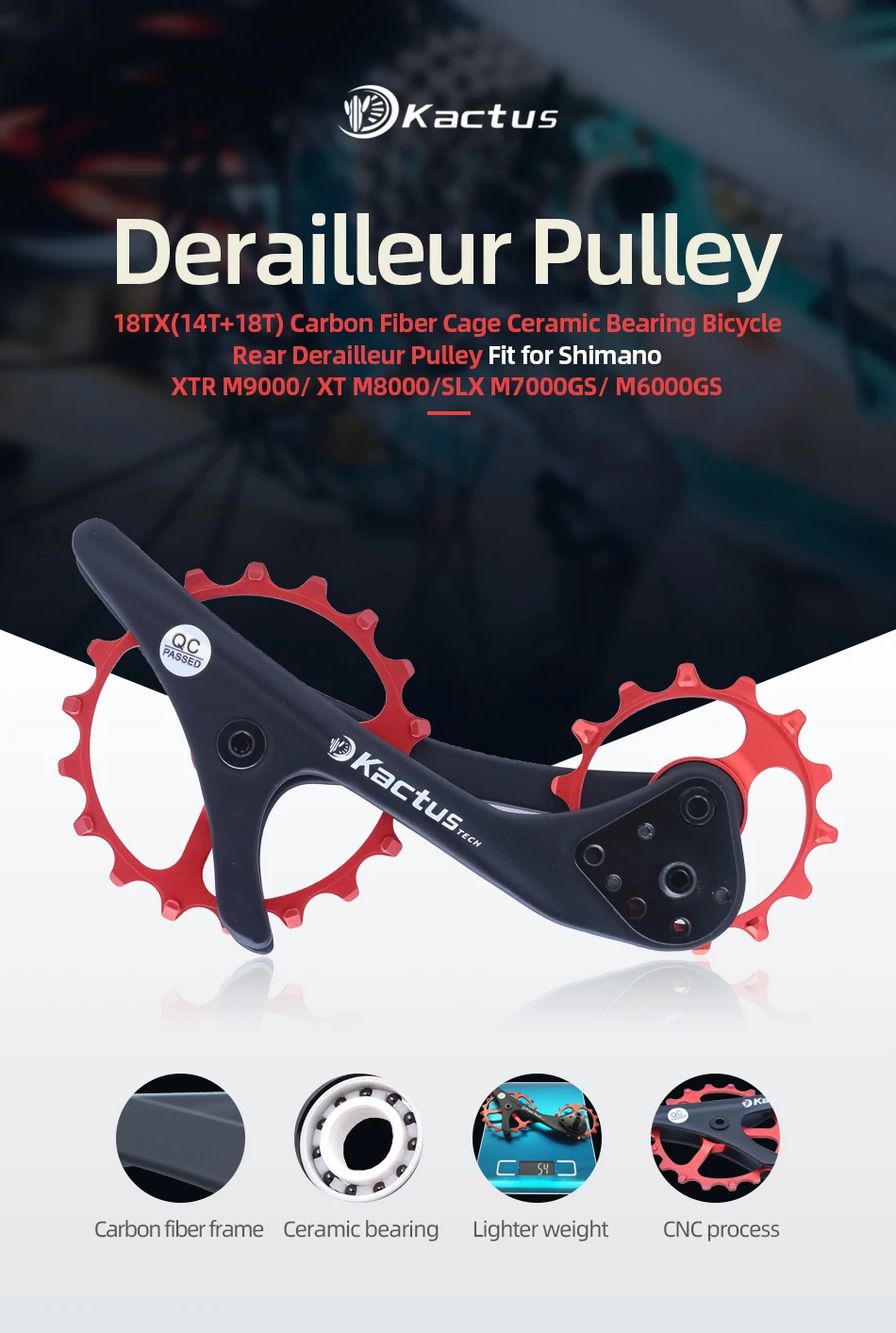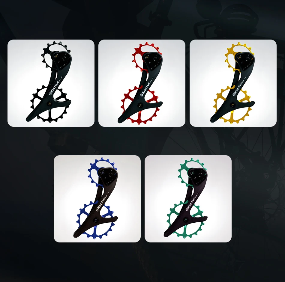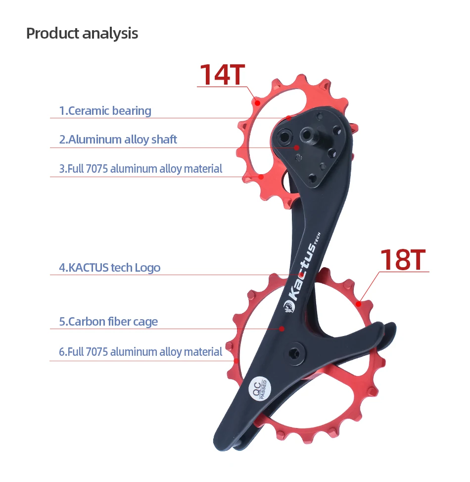 5-е преимущество: для серии Shimano MTB, верхний шкив реализует Оптимизированный дизайн 14t lotus, с более сложным углом кривой и формой зуба, предотвращение аномального движения цепи во время переключения, который обычно обнаруживается в модификациях расширения кассеты, т. Е. 46T до 50T, что приводит к понижению шума и трению и более быстрому плавному переключению.