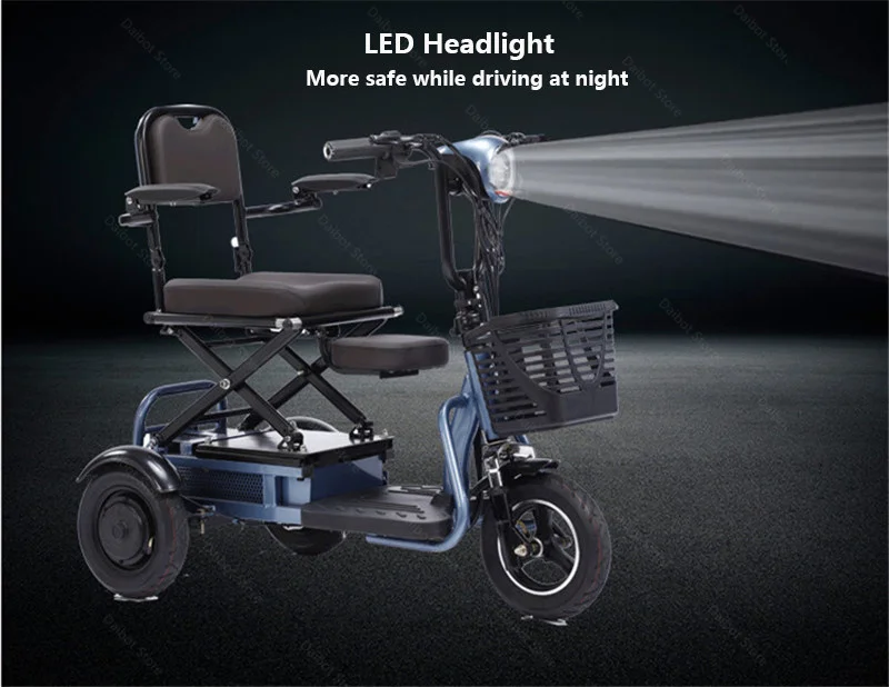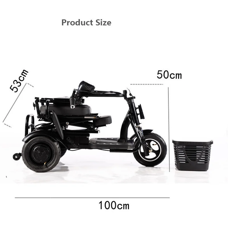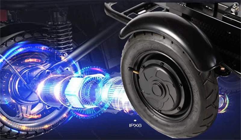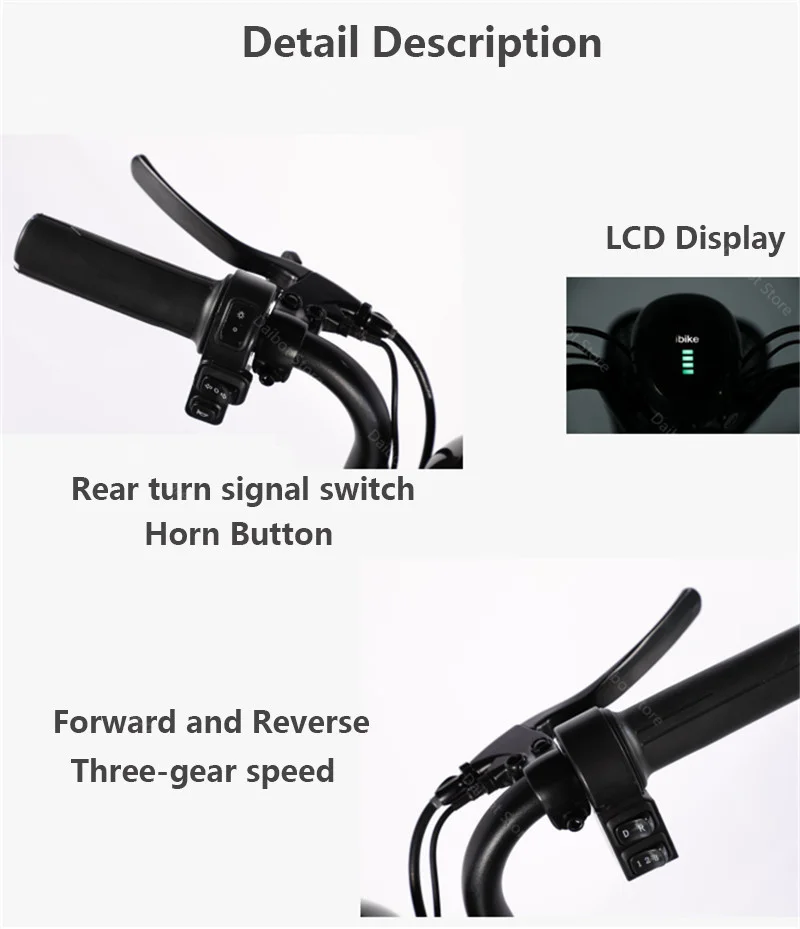 Особенности:Система заднего колеса с двойным дисковым тормозом, система переднего двойного амортизатора, дисплей питания, светодиодная фара, поворотная лампа, система заднего хода, три режима скорости, держатель телефона, противоугонная сигнализация передняя корзина, батарейный замок.