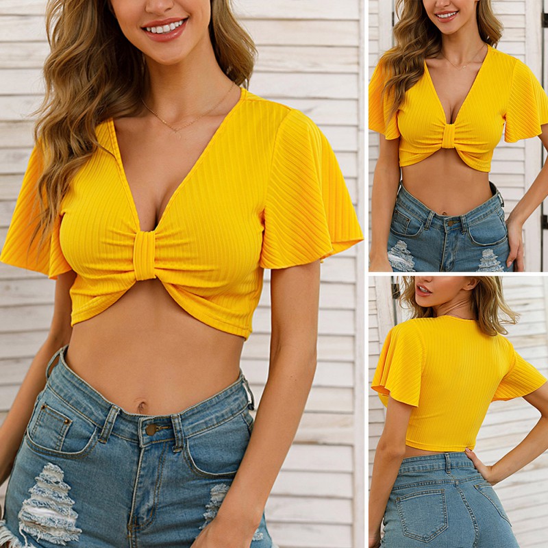 Сексуальная короткая одежда с узлом на груди с глубоким v-образным вырезом и коротким рукавом для отдыха