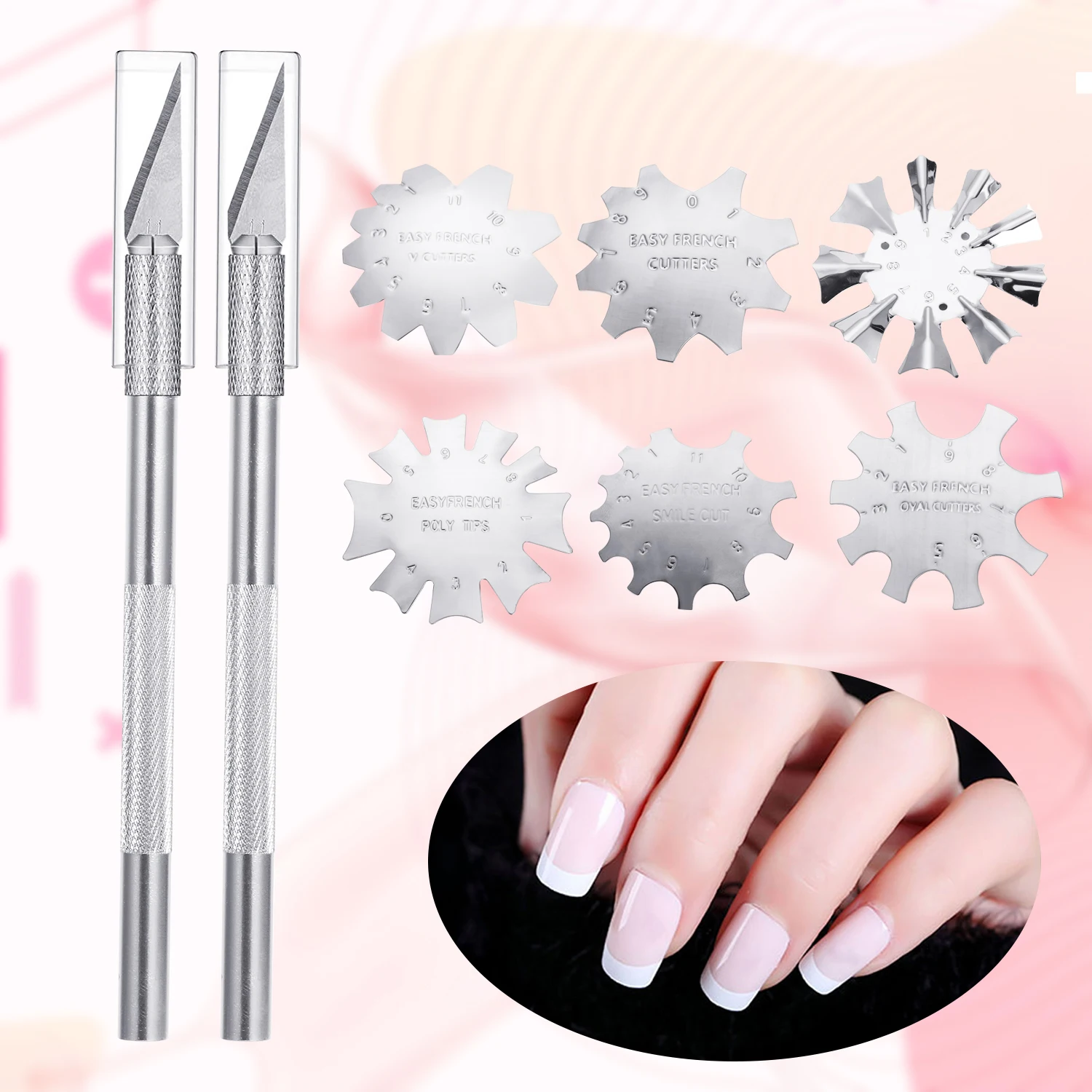 9 размеров, легкий, французский, смайлик, v-образная линия, форма миндаля, наконечники, c-образная, металлическая, для маникюра, кромка, триммер, розовый/белый, акриловый инструмент для ногтей