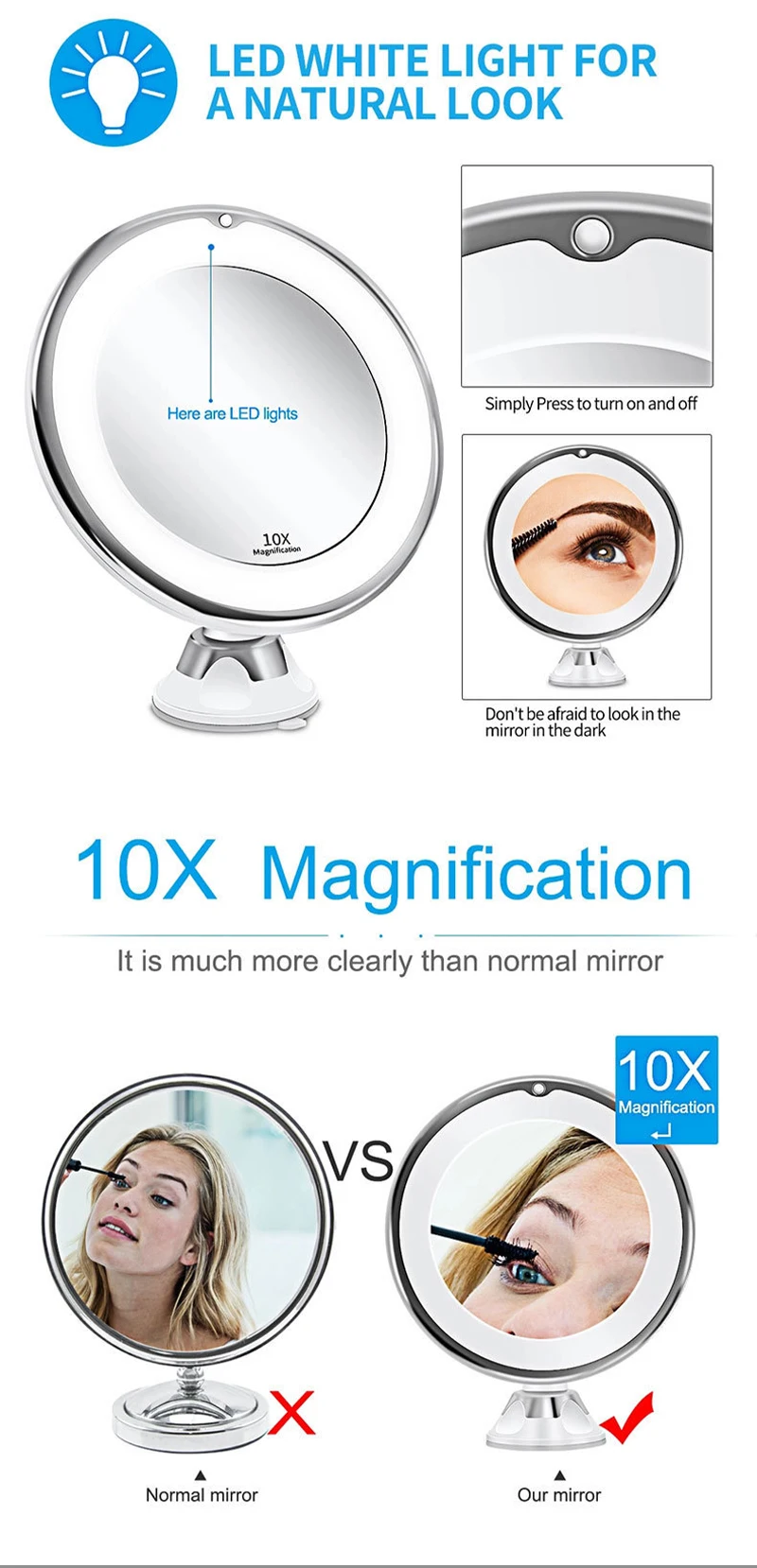 Диаметр: 17,5 см/7 дюймов. Требуется три батарейки AAA (не входят в комплект) натуральный теплый Светодиодный светильник: эффективный светильник светодиодный s, который прослужит долгое время и обеспечит наиболее точный естественный светильник, с которым вы столкнетесь в течение дня. Сверхмощные присоски-быстрые и простые фиксирующие чашки обеспечивают плавное соединение поверхности. Эта конструкция достаточно вязкая для большинства поверхностей, но не прилипает к необработанным Мраморным, пористым или шероховатым поверхностям. 10x увеличение: идеальное увеличение, чтобы вы могли видеть ваше лицо в зеркале. Гибкая рукоятка и всасывание: вращается на 360 ° для регулируемых углов, что позволяет расположить зеркало ближе к вам по сравнению с конкурирующими зеркалами для макияжа. Товары не содержат батареек, увеличивающих всасывание присоски: 1. Протрите стену влажным полотенцем или намочите присоске перед использованием. 2. Нанесите яичный белок на поверхность присоски