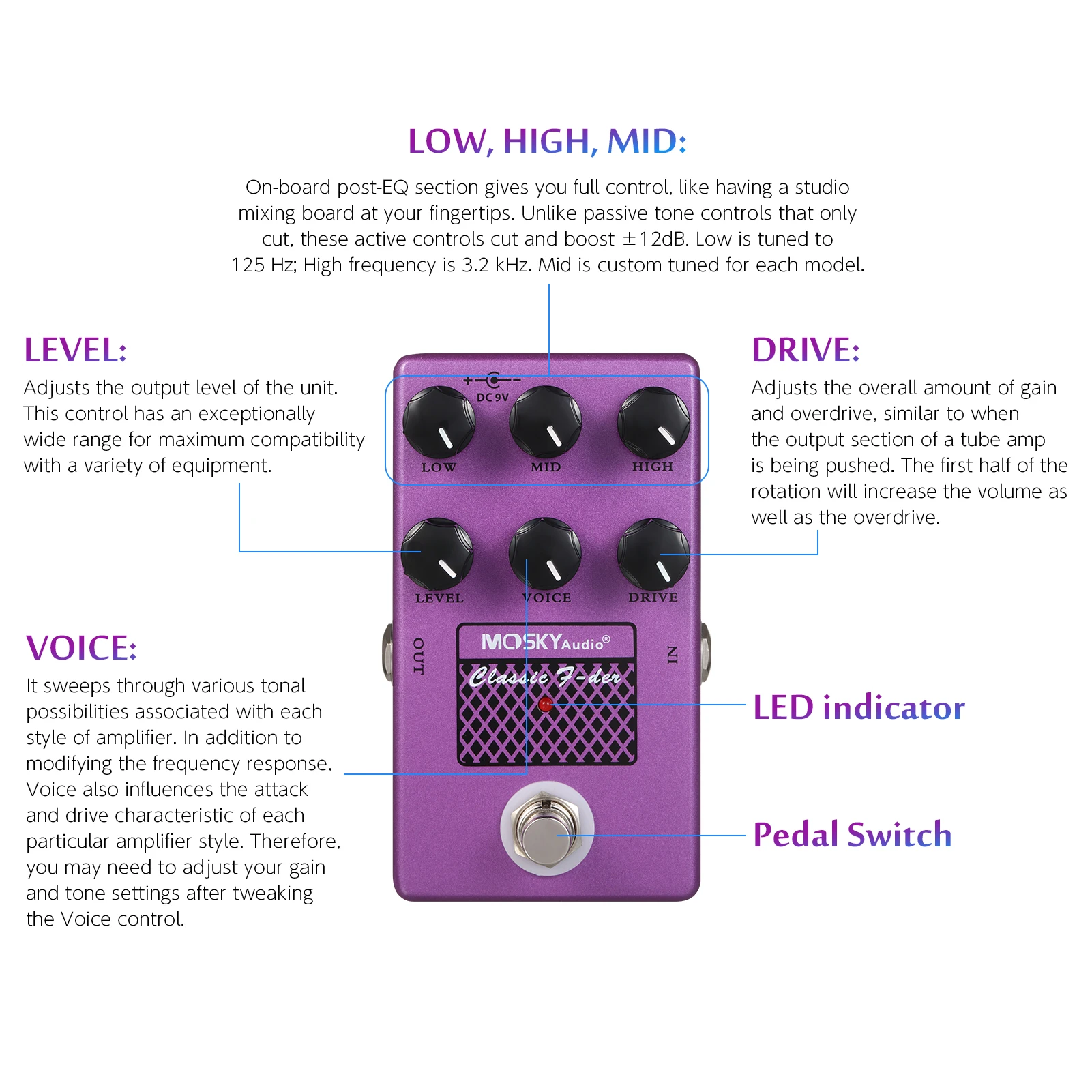 Голос: Озвучены по-разному для каждой педали в серии. Он проходит через различные тональные возможности, связанные с каждым стилем усилителя. Помимо изменения частотной реакции, голос также влияет на атаку и характеристики привода каждого конкретного стиля усилителя. Поэтому вам может потребоваться настроить настройки усиления и тона после настройки голосового управления.