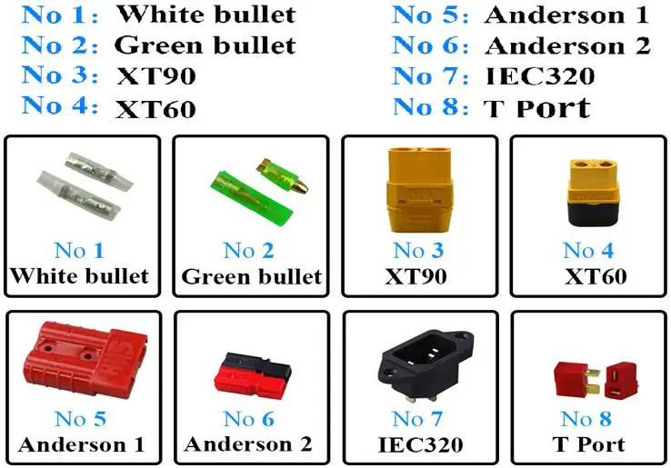 Выходной разъем зарядного устройства:Если у вас нет запроса, разъем зарядного устройства будет соответствовать разъему зарядного устройства. Разъемы XLR, DC, RCA, Anderson, XT30, XT60, IEC320 или T.