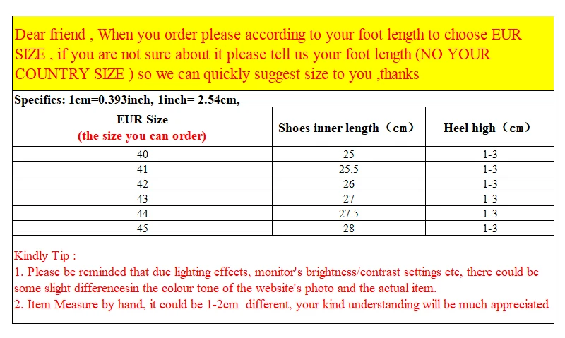 Внимание:1. Может наблюдаться небольшая разница в отображении цветов из-за настроек монитора компьютера.2. Из-за разных способов измерения, пожалуйста, al3 отклонения в размере на 1-3 см (1 см = 0,39 дюйма). Благодарим за понимание!3. Наш размер не является стандартным Европейским размером, и он равен только длине стопы!4. Стандартные размеры разных стран и разных производителей отличаются, длина вашей стопы является единственным критерием для выбора размера.