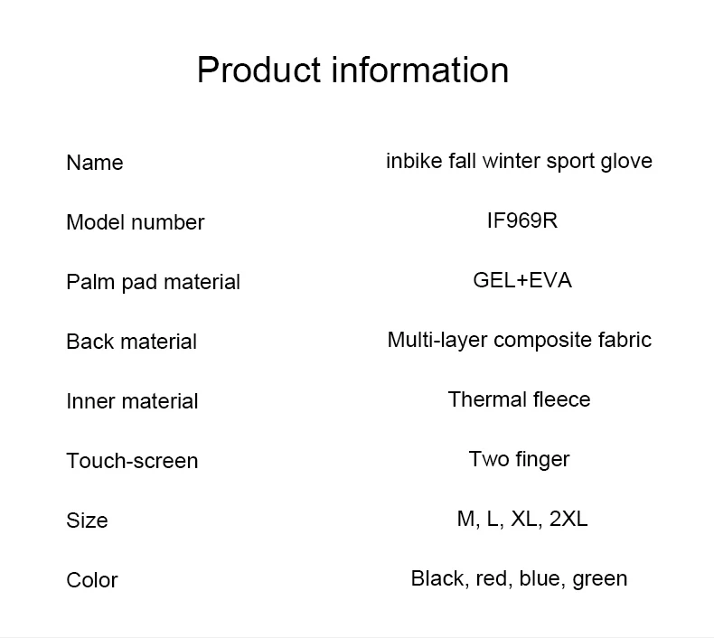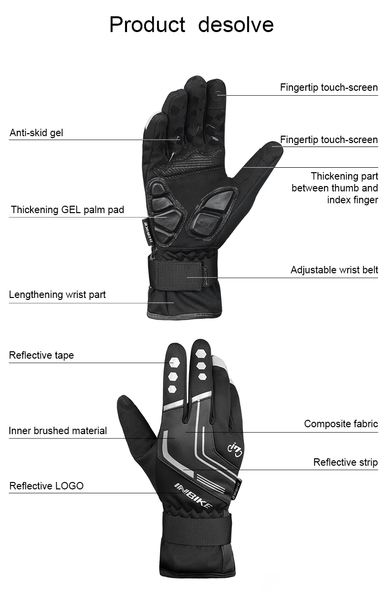 Особенности:1. Сенсорный экран с кончиками пальцев.Это удобно для вас, чтобы справиться с мобильным устройством во время езды2. Ударопрочная ладонь, Ладонь принимает микрофибры композитные фланелевые,Работает, мы будем в ударопрочныхИ противоскользящие.3. Светоотражающая лента на перчатках может повысить видимость в ночное время езды.4. Тепловые, перчатки сзади изготовлены из ветронепроницаемой композитной ткани,Обладает хорошей теплостойкостью и защитой от ветра5. Дизайн регулировки запястья, хорошо подходит для вашей руки