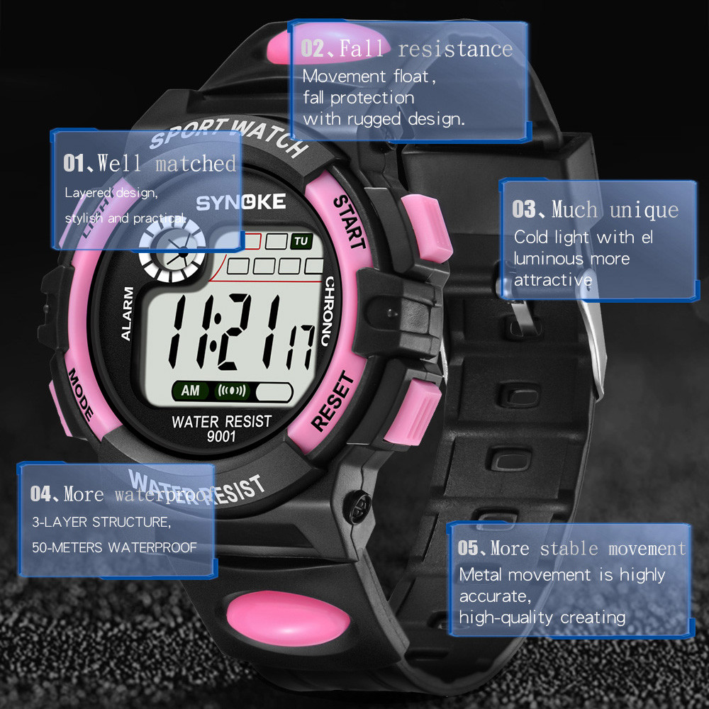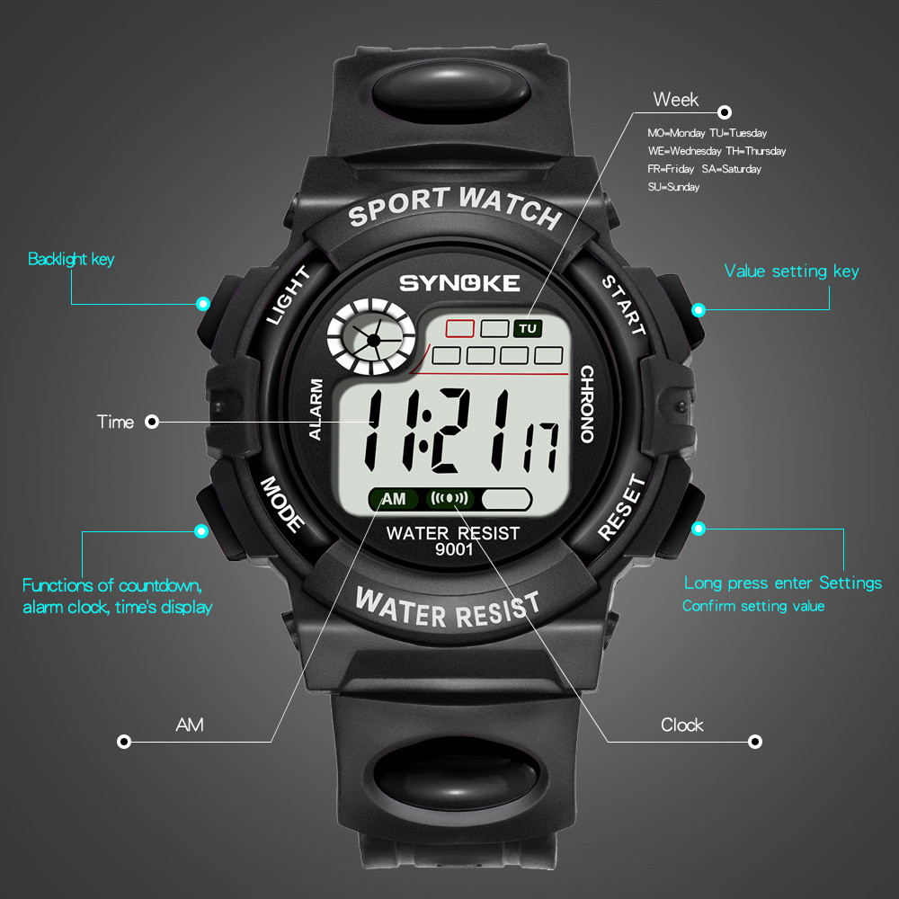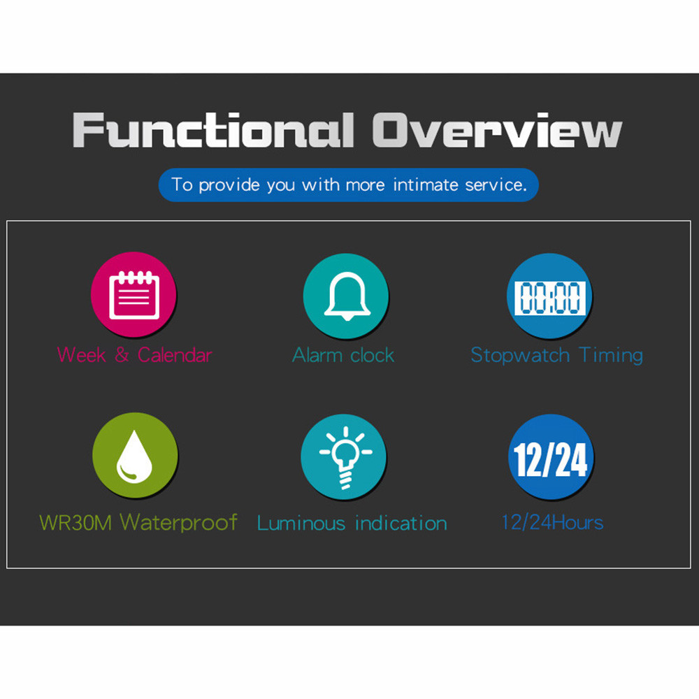Функция: световой сигнал, будильник, WR30M Водонепроницаемость, ежечасный час, время работы, отображение дня недели, 12/24 часовая система