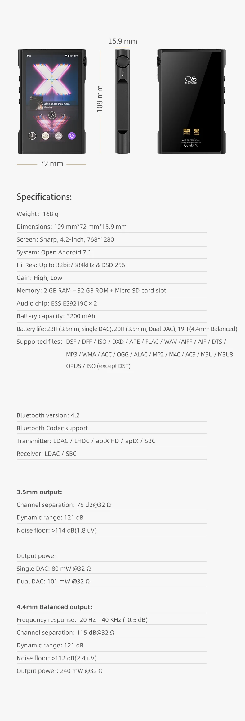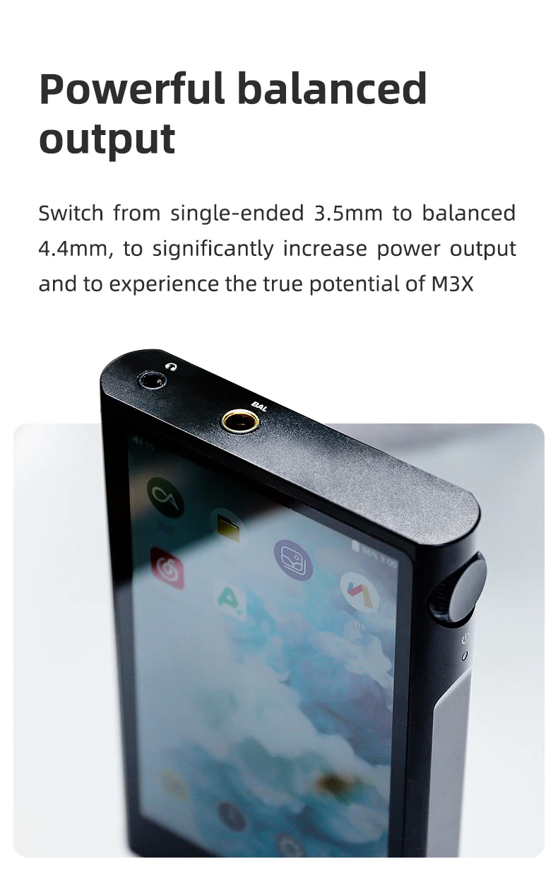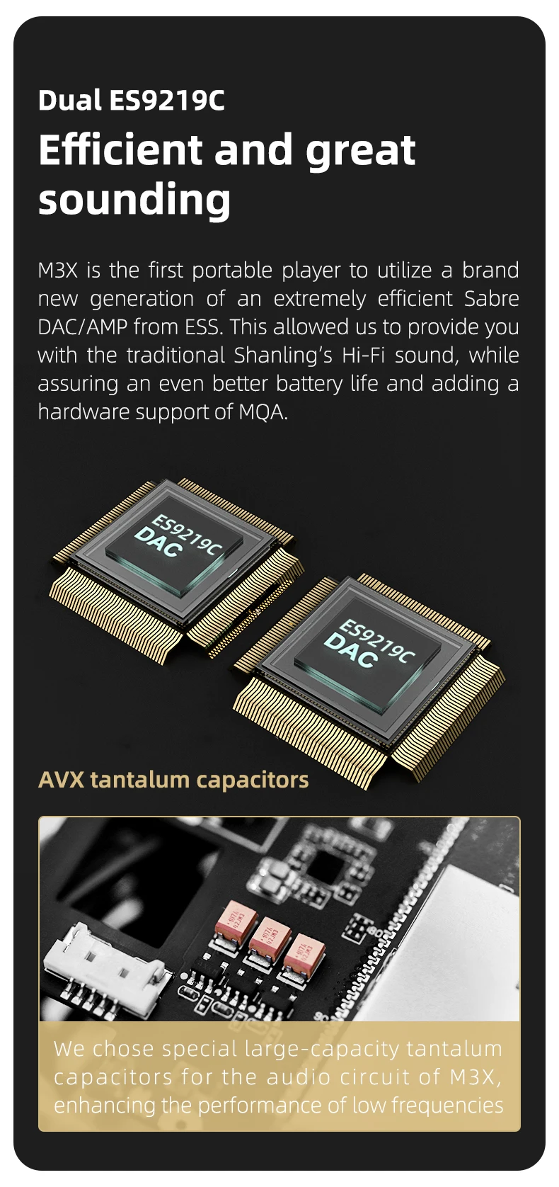 1. Эффективное и отличное звучание: M3X является первым портативным плеером, который использует совершенно новое поколение чрезвычайно эффективного DAC/AMP от ESS. Это позволяет нам обеспечить вас традиционным Hi-Fi звуком Shanling, обеспечивая еще лучший срок службы батареи и добавляя аппаратную поддержку MQA.