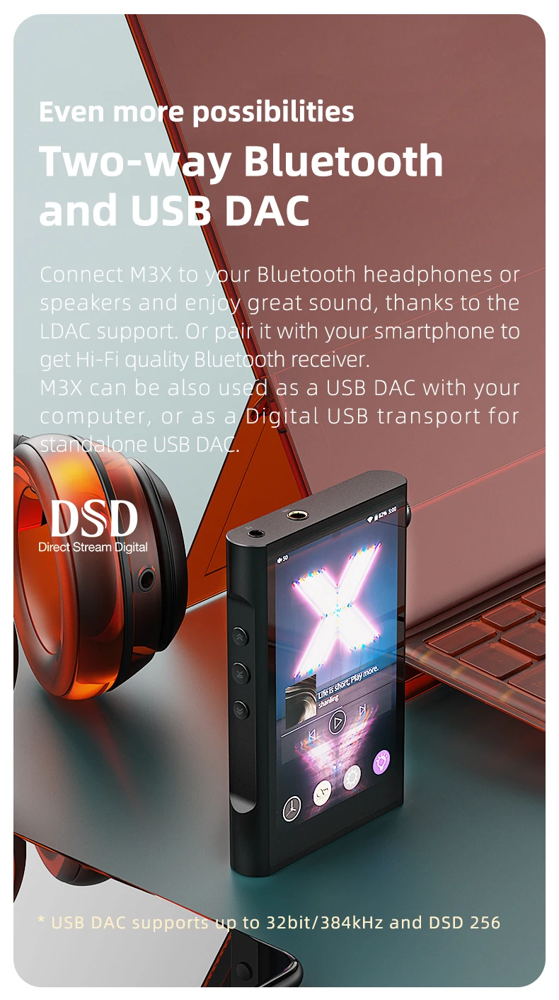 3. Двусторонний Bluetooth и usb-цап: Подключите M3X к bluetooth-наушникам или динамикам и наслаждайтесь отличным звуком, благодаря поддержке LDAC. Или соедините его со своим смартфоном, чтобы получить Hi-Fi качественный bluetooth-приемник. M3X также можно использовать в качестве usb-dac с вашим компьютером или в качестве цифровой usb-передачи для автономного usb-dac.