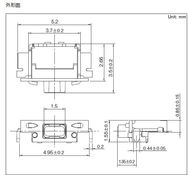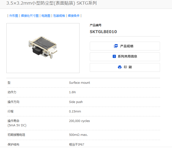 Imported from Japan SKTGLBE010 small dust-proof tact switch 3.5*3.2 side-press semi-mount SMT IP level 67 or higher, button with bracket micro-movement, button strength 1.6N, long life, high temperature resistance There are detailed information on the size drawing