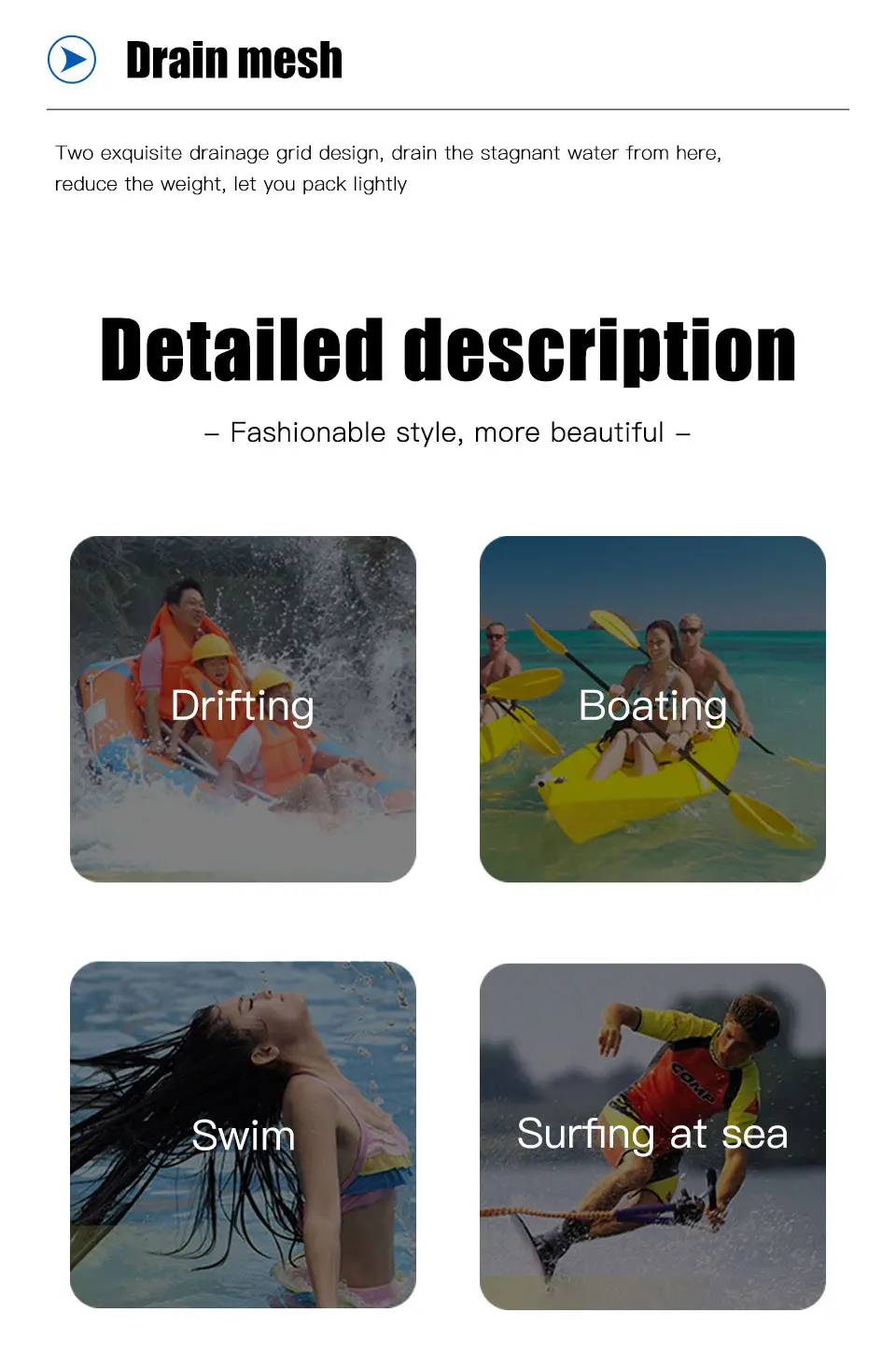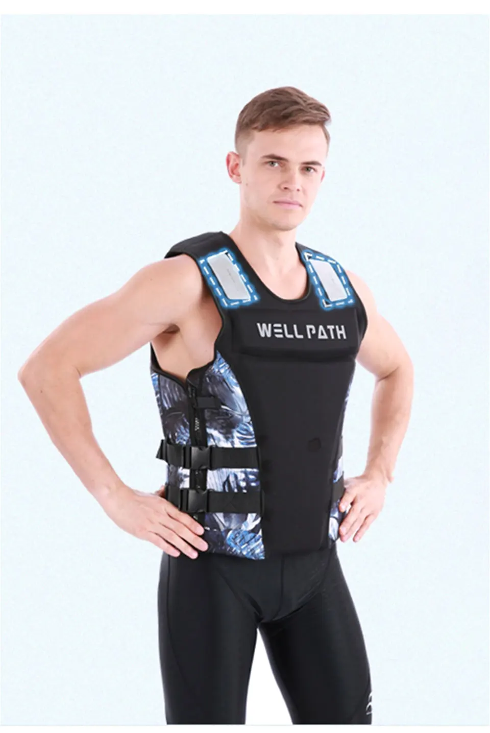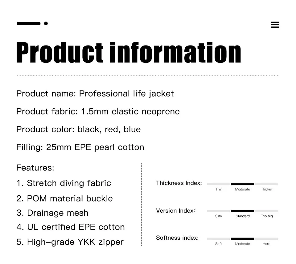 Характеристики: 1. Тянущаяся ткань для дайвинга 2. Пряжка из материала POM 3. Дренажная сетка 4. Сертифицированный UL хлопок EPE 5. Высококачественная молния YKK
