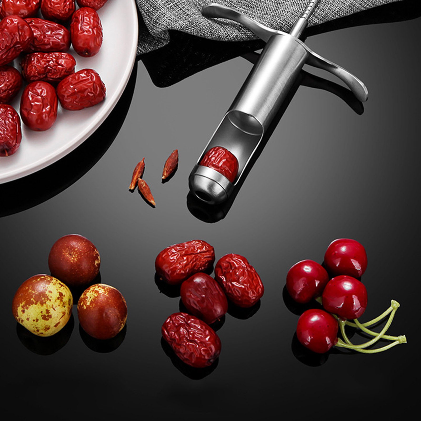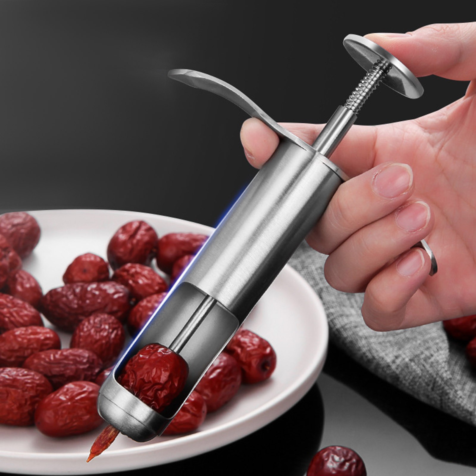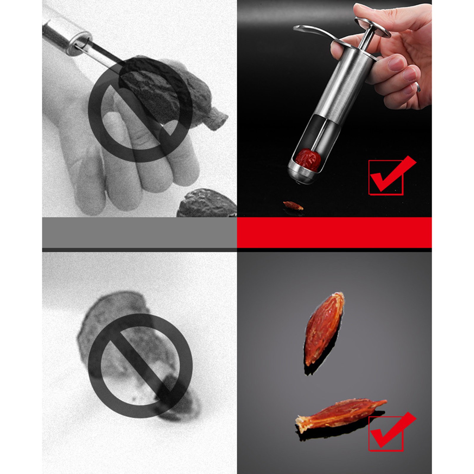 100% новый товар высокого качества. Изготовлен из нержавеющей стали 304, прочный и не ржавеет. Не причиняйте вреда вашим рукам, легко мойтесь. Ручка имеет пружинный дизайн, и ее легко снять. Фиксированная конструкция паза давления, легко нажимать в jujube, быстрая энуклеация.Посылка включает в себя: