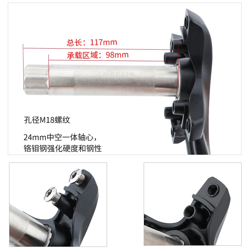 Кривошип BCD104mm/64mm конструкция совместима с одиночным кольцом цепи/двойным кольцом цепи переменной скорости. Установка проста, и запорный винт можно зафиксировать. Конструкция внутреннего потайного винта делает запорный винт не выступающим, а общий внешний вид лучше.