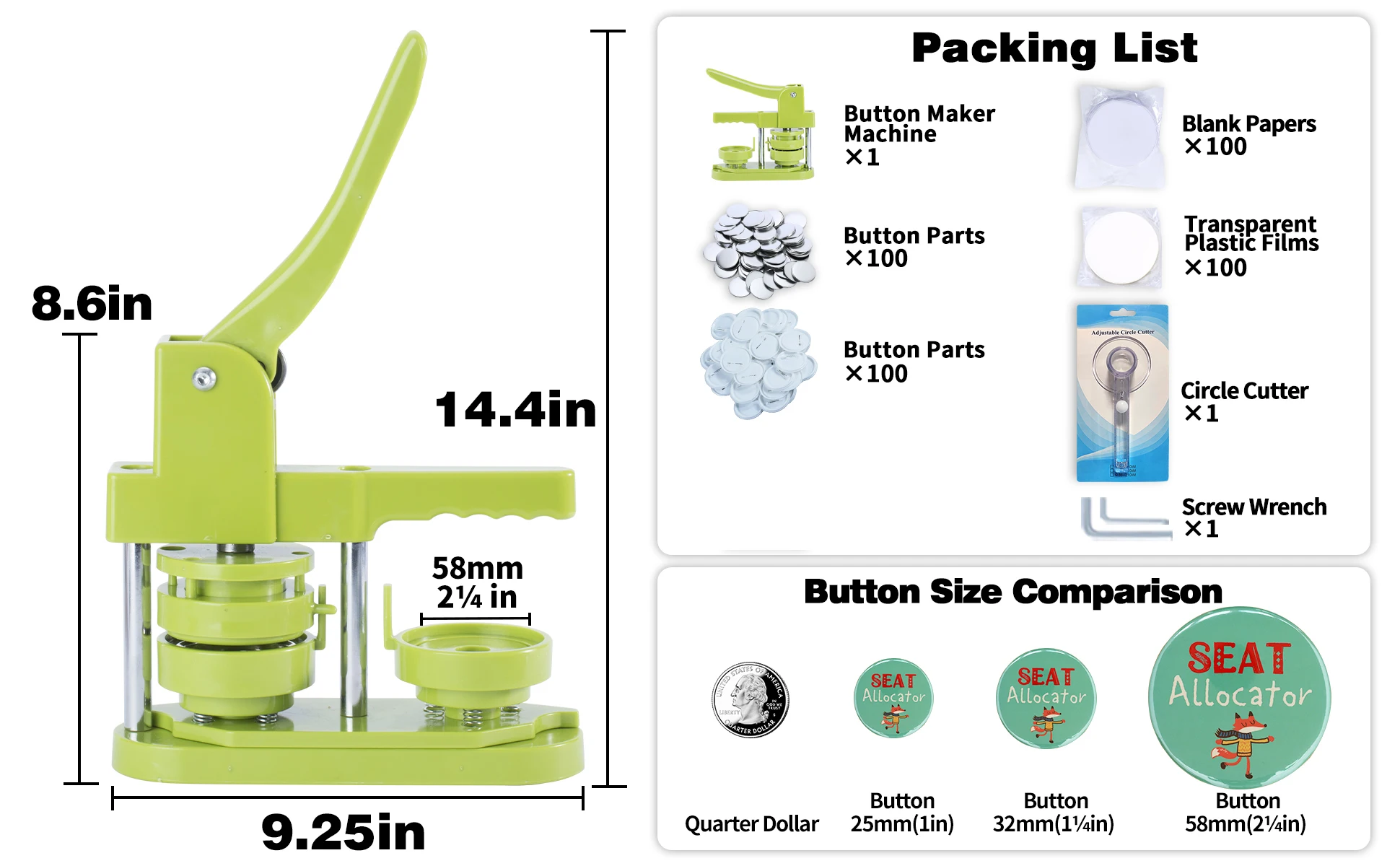 Набор для изготовления значков «сделай сам» включает в себя-58 мм (2 ¼ дюйма) устройство для создания значков, 100 шт. частей для кнопок, 58 мм (2 ¼ дюйма) резец круга, 100 шт 58 мм (2 ¼ дюйма) фотографии