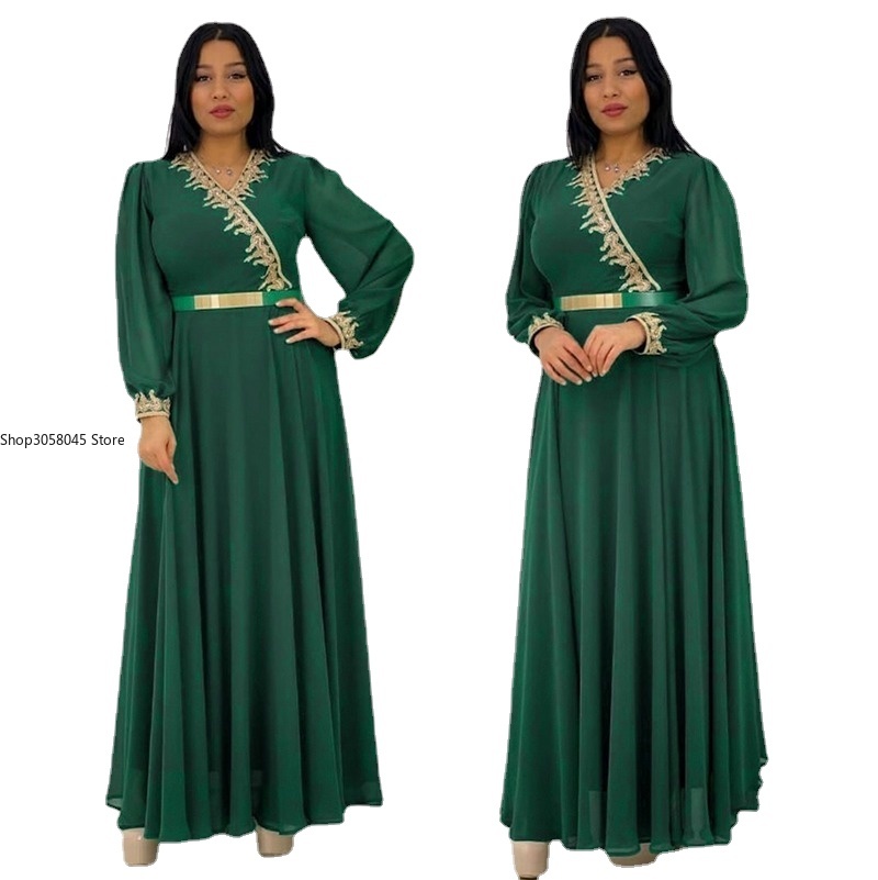 Muslim Fashion Plus Size Ethnic Maxi Dress For Women 2021 New Gold Ribbon Patchwork V Neck Long Sleeve Modest Arabic Clothes