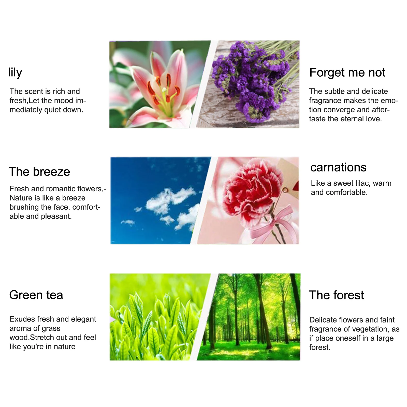Аромат: роза, лаванда, лимон, океан, жасмин, Незабудка, лес, сандаловое дерево, Бриз, лилия, зеленый чай, гвоздика