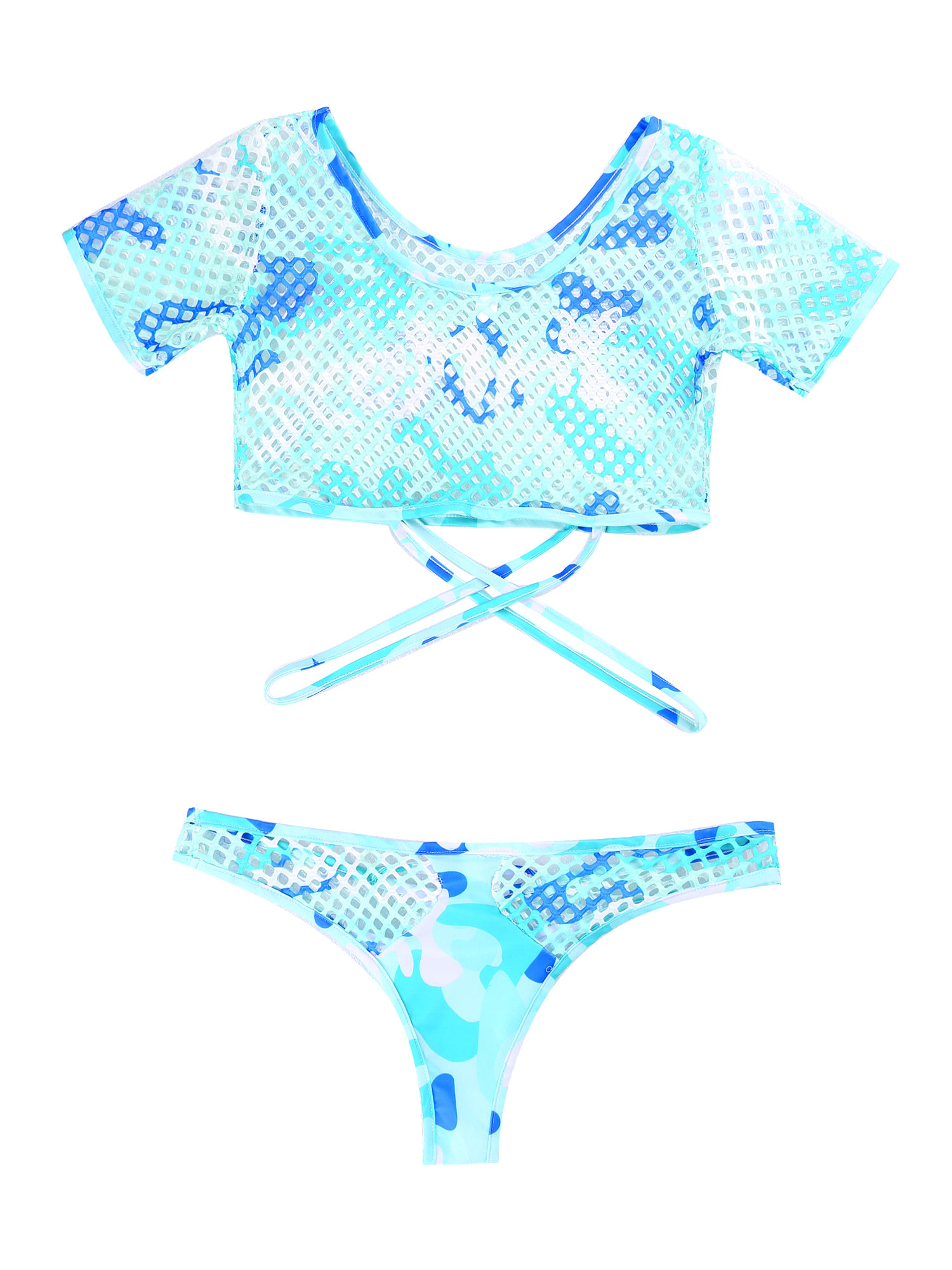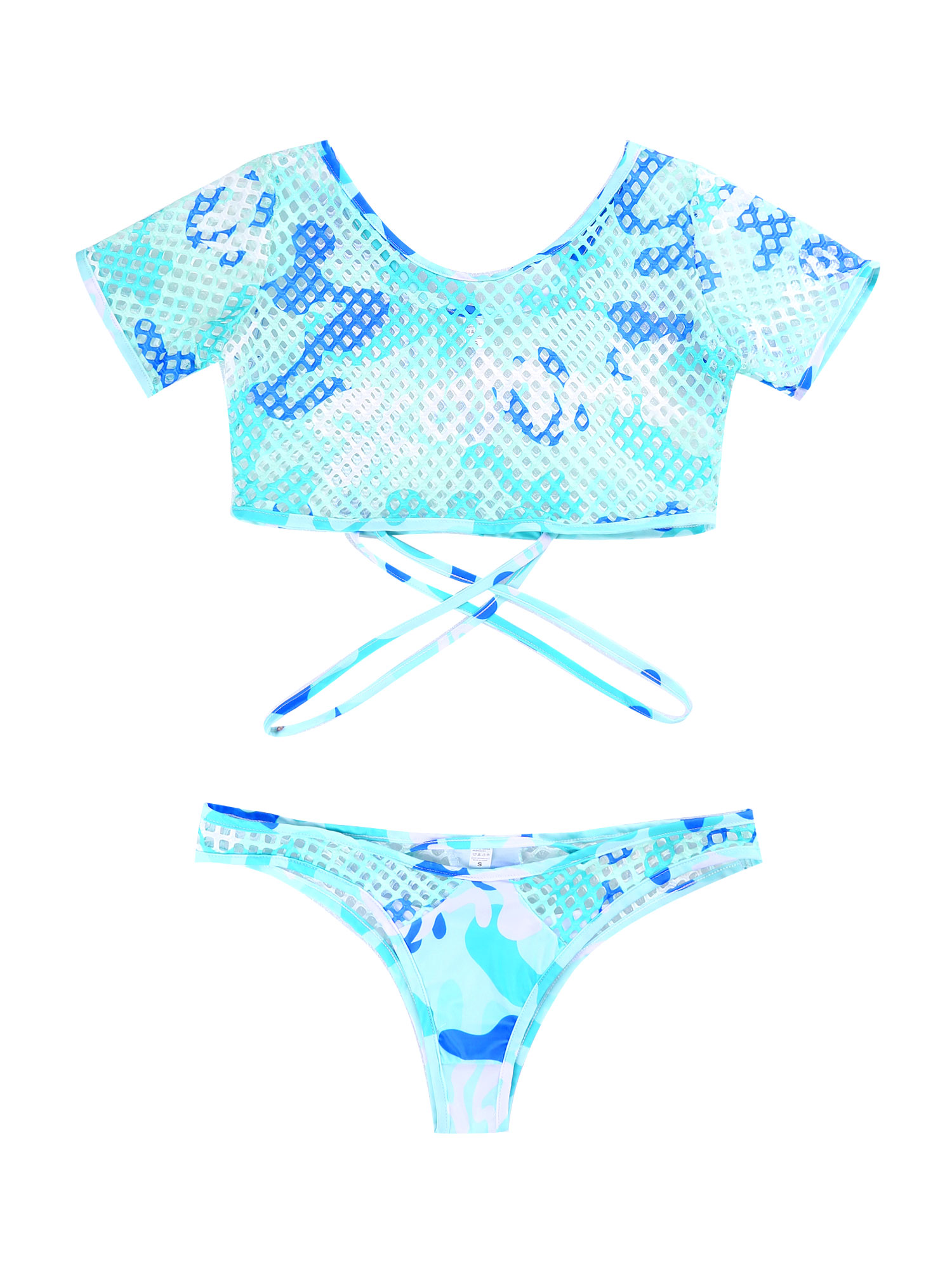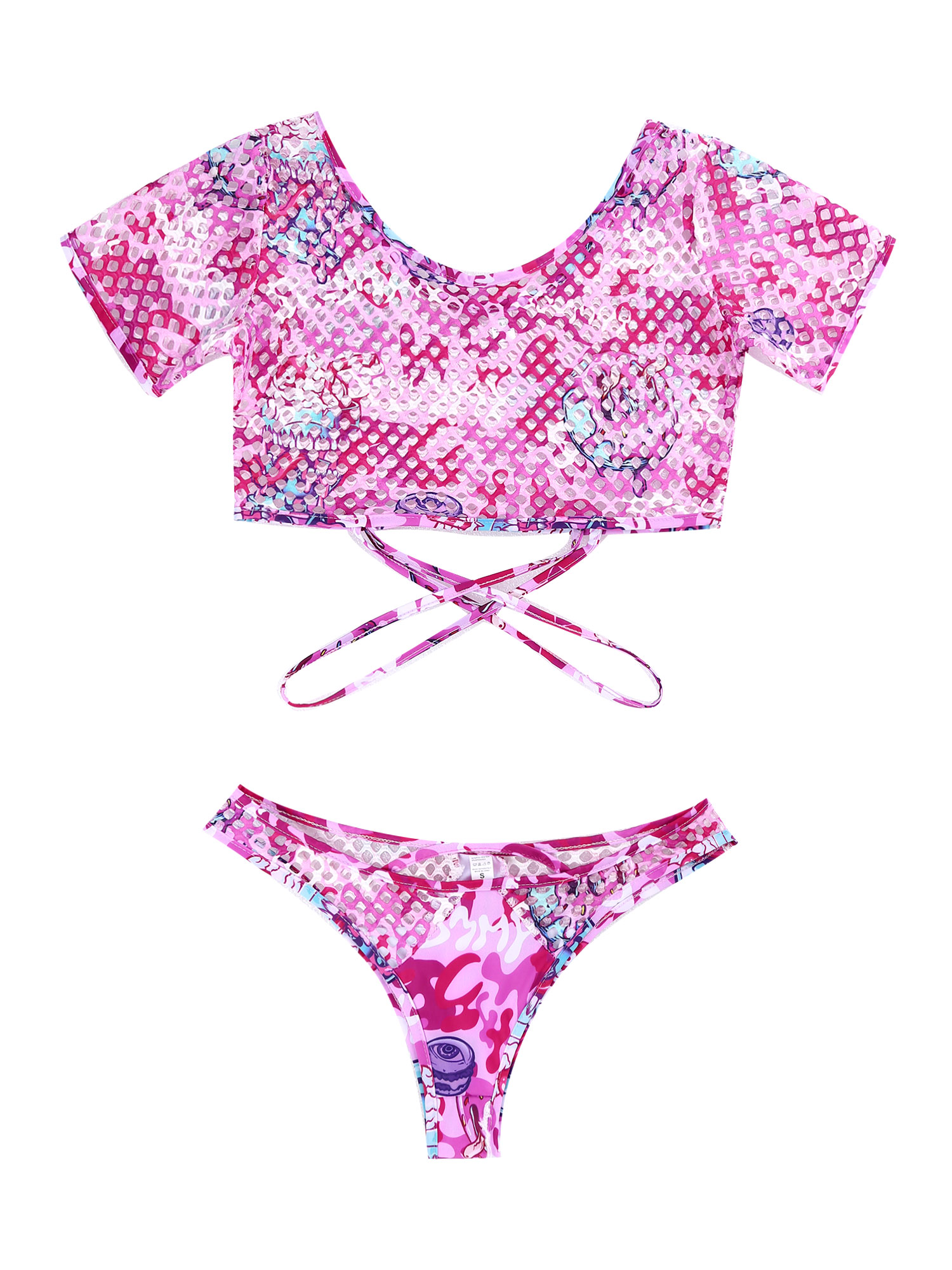 Женский стильный комплект из двух предметов с принтом, ажурные сетчатые наряды, укороченный топ с бикини.
