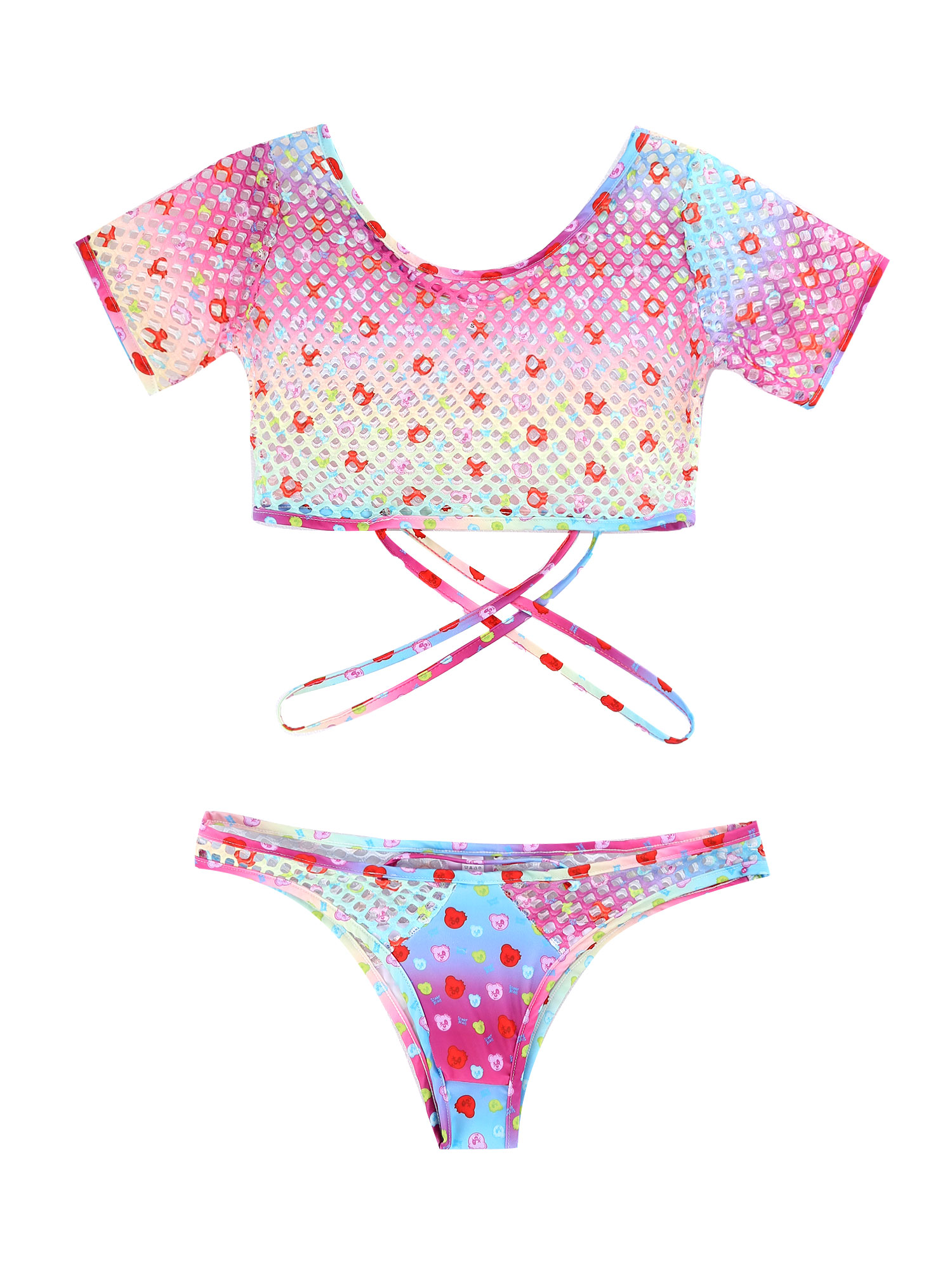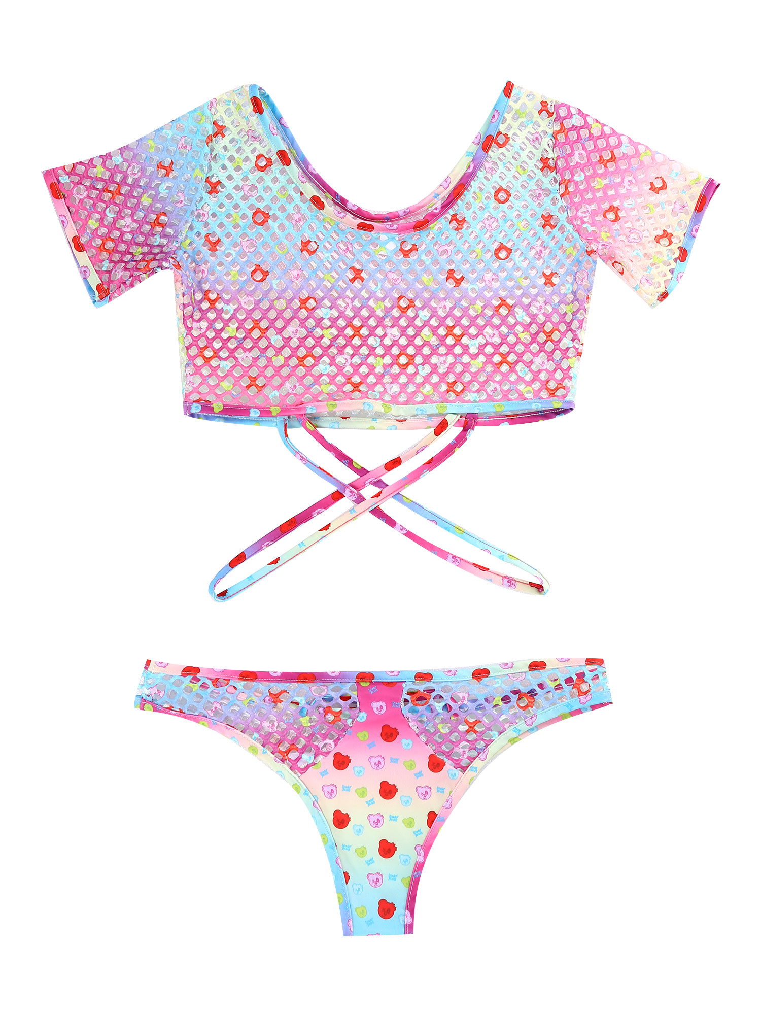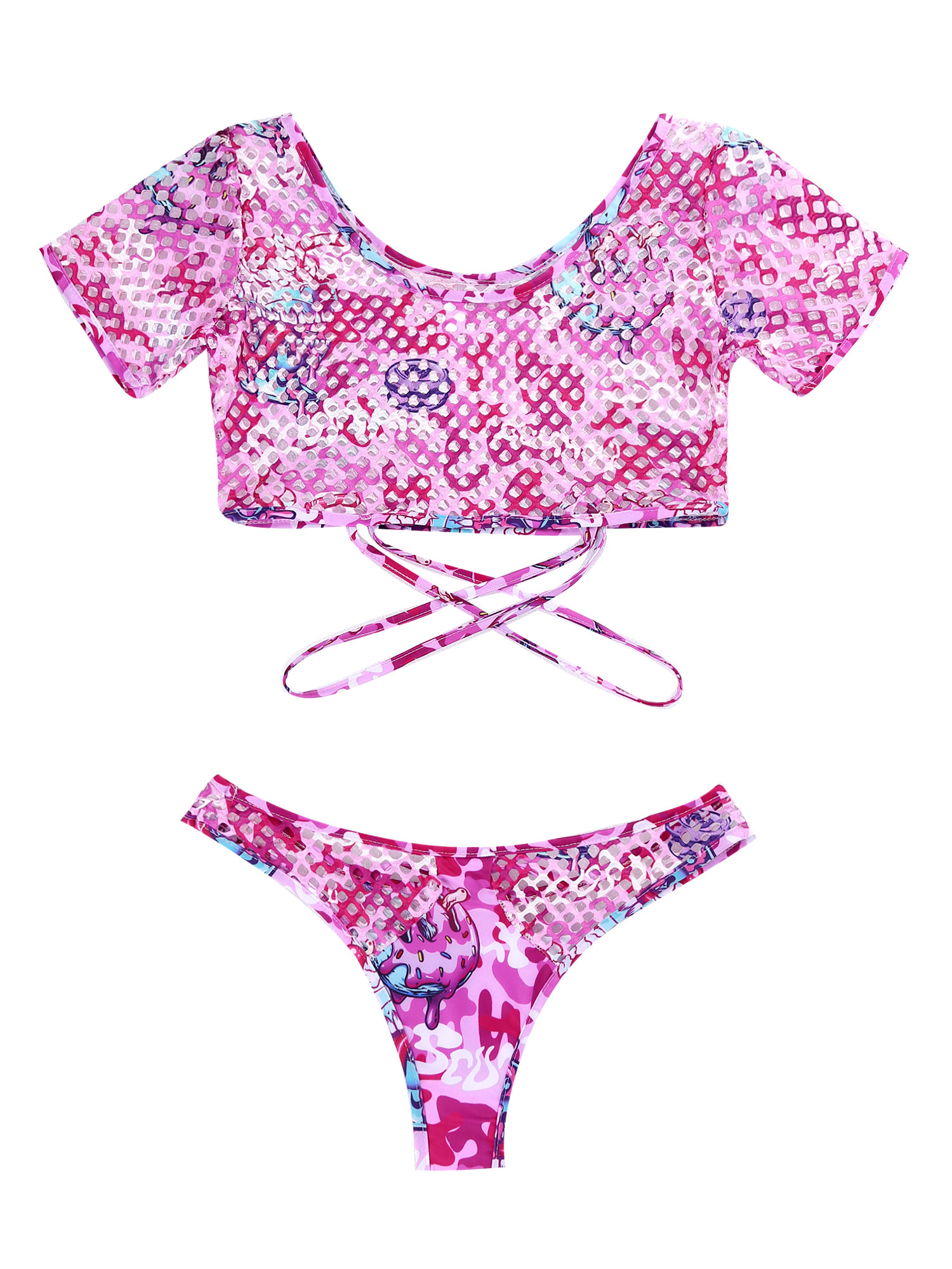 Женский стильный комплект из двух предметов с принтом, ажурные сетчатые наряды, укороченный топ с бикини.