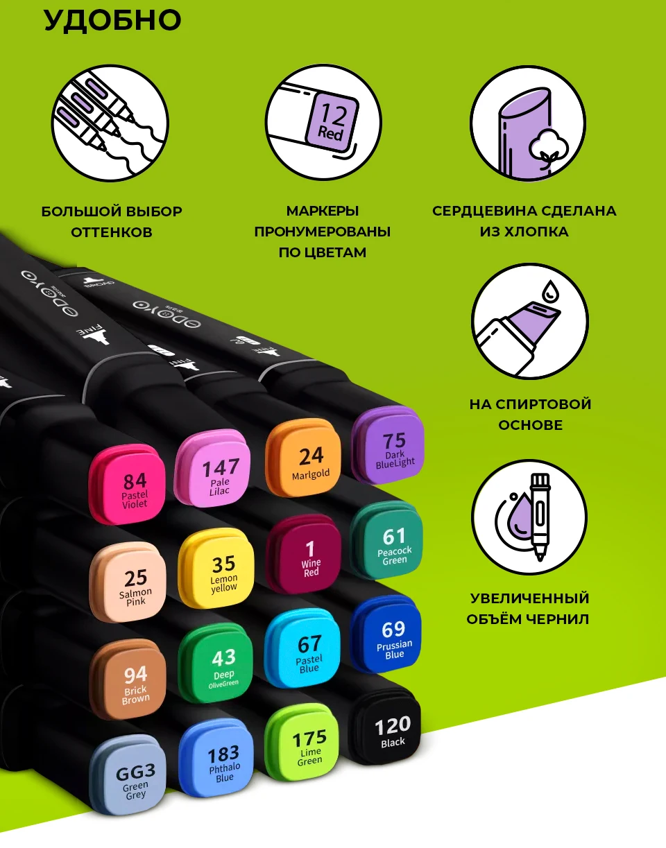 Маркеры ODOYO на спиртовой основе, станут идеальным инструментом для иллюстраторов, студентов и всех людей, увлекающихся творчеством. Создавайте яркие скетчи, манга, комиксы, декоративные открытки, занимайтесь скрапбукингом.