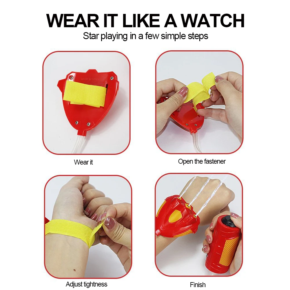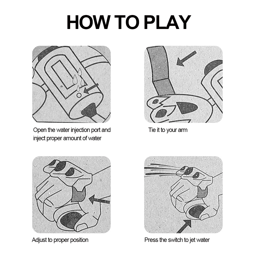 * 3. Как использовать: просто закрепите водяной пистолет на запястье, удерживайте триггер в руке и нажмите кнопку, чтобы струя воды.