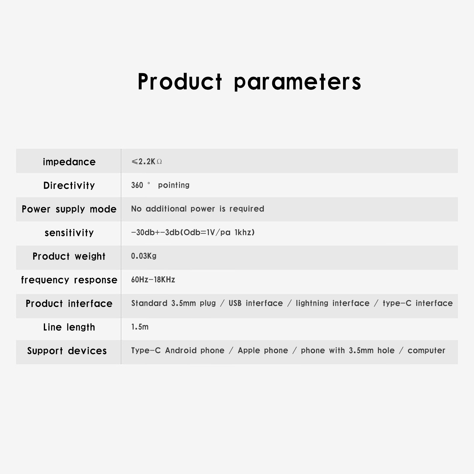 Цвет: черный Длина кабеля: 1,5 м Применимые варианты: запись, радио и телевидение, конференции, интервью Размер головки микрофона: high 6,0 × 2,2 мм Высокочувствительный анти-помех микрофон Сердечник Чувствительность: -32 дБ ± 1 дБ Направленность: всенаправленный Сопротивление: ≤ 2,2kΩ Рабочее напряжение: 2,0 V Частотный диапазон: 100-16 кГц Отношение сигнал-шум: более 60 дБ Диаметр штекера: 3,5 ммВключает: