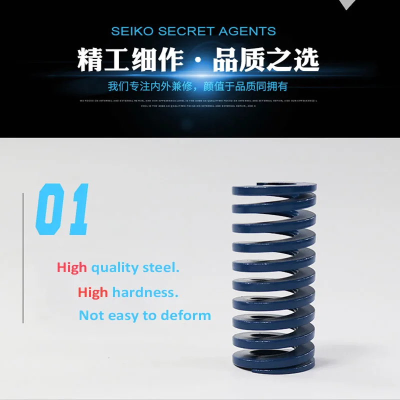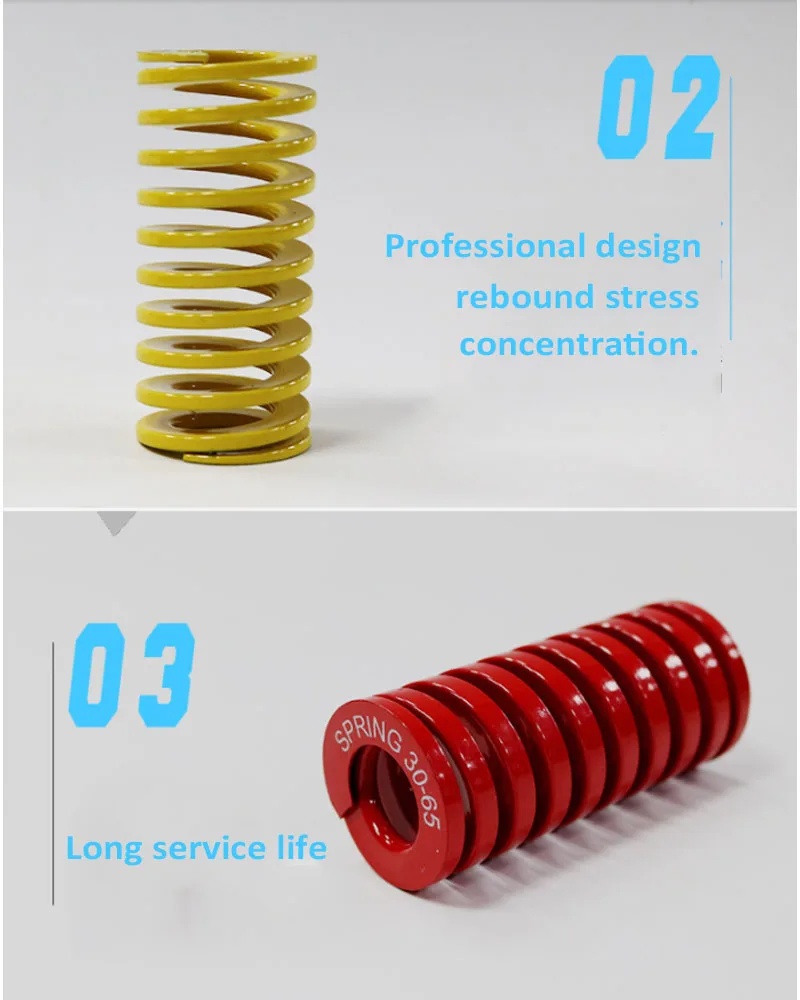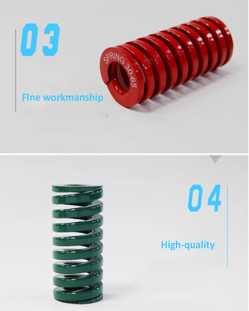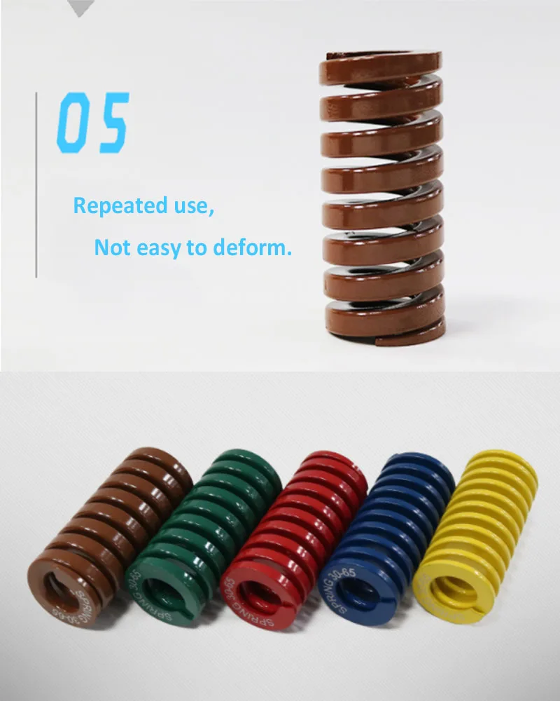 Пружина широко используется в штамповке, литье под давлением металла, пластиковых штампов и других высокоточных механических оборудованиях, автомобилях и других областях. Примечание: желтый и синий в основном используются для сборки пластиковых форм, в то время как красный, зеленый и загар в основном используются для сборки оборудования.