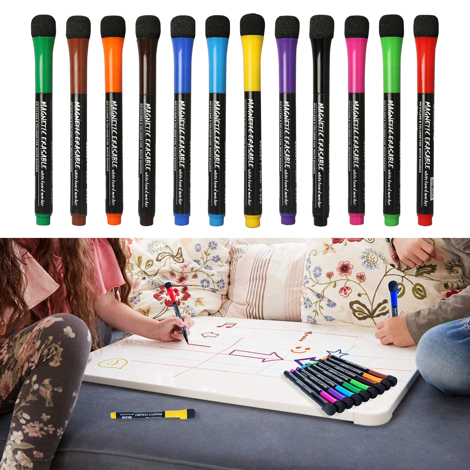 Маркеры сухого стирания содержат 12 ярких цветов. Отметки могут быть четко видны в классе или конференц-зале.