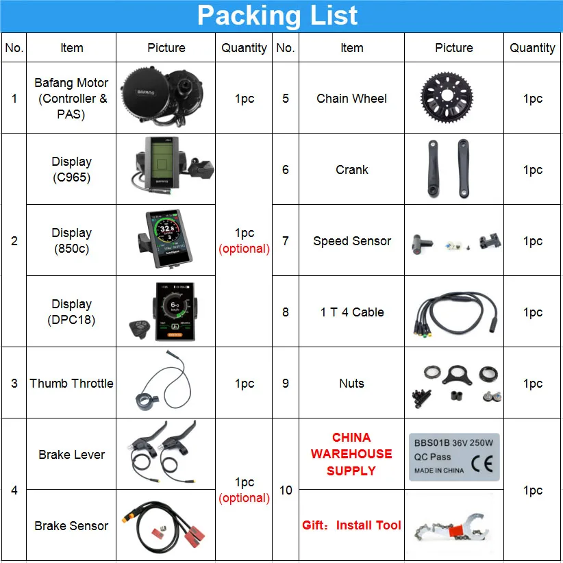1 пара * цепное кольцо (BBS01,BBS02 44T/46T/48T/52T опционально, 1000W 42T/46T, 46T по умолчанию)