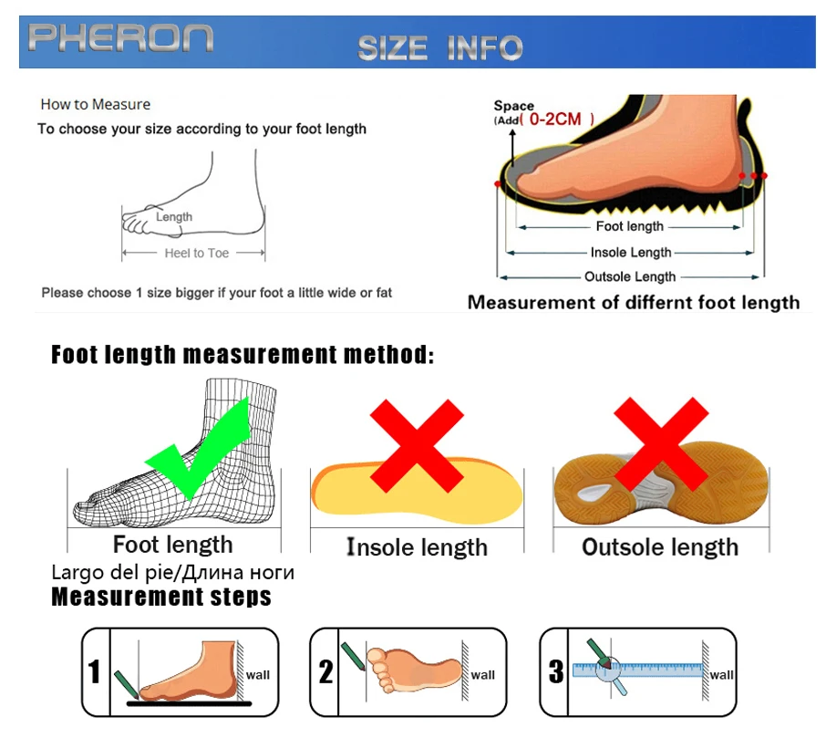 1. Пожалуйста, выберите размер в соответствии с длиной стопы (Не выбирайте размер в соответствии с обычным размером вашей страны!)