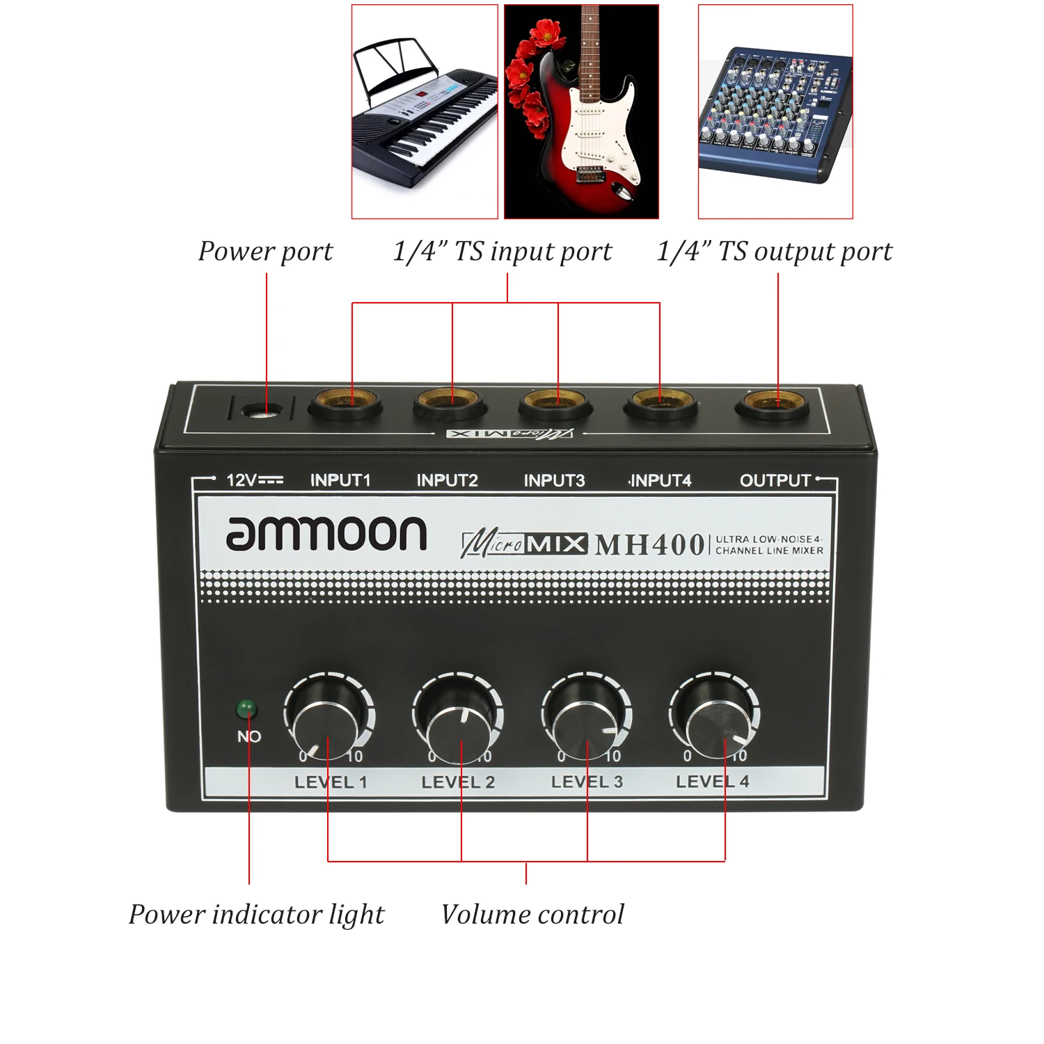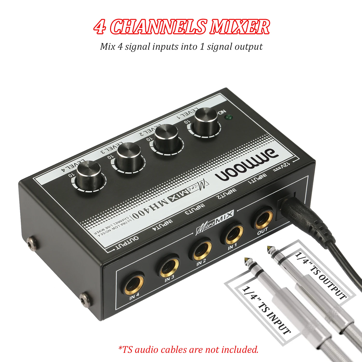 Смешанный 4 аудио входа-Аудиомиксер может подключать 4 устройства (например, клавиатуру, инструменты и т. д.) к 1/4 дюймовым TS разъемам, смешивать 4 сигнальных входа в 1 Сигнальный выход.