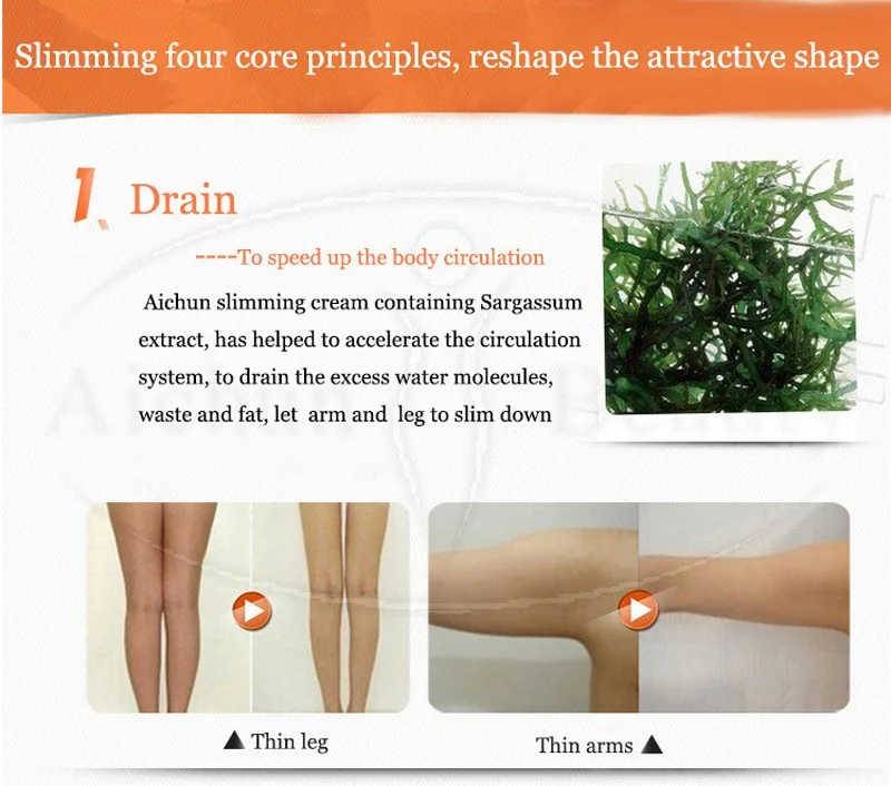 Слив ---- для ускорения циркуляции телаAichun крем для похудения, содержащий саргассумЭкстракт, помог ускорить циркуляциюСистемы, чтобы слить лишние молекулы воды,Отходы и жир, пусть руки и ноги стройнят