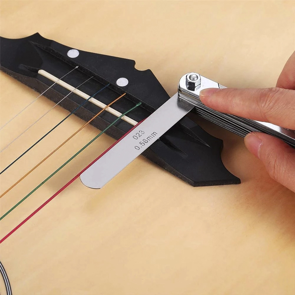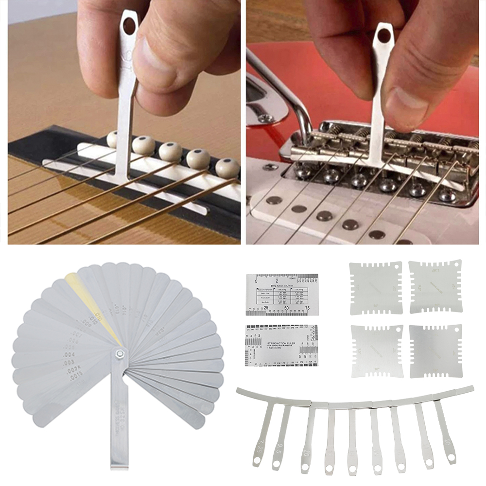 5. Зубчатый радиус gage: включает в себя 2шт узкий радиус gage и 2шт большой радиус gage: 7,25 ", 9,5", 10 ", 12", 14 ", 15", 16 ", 20", эти радиус gage параллельны пальцу, Позволяет быстро и точно найти кривизну грифа или моста с помощью этих радиусов, не снимая струны.