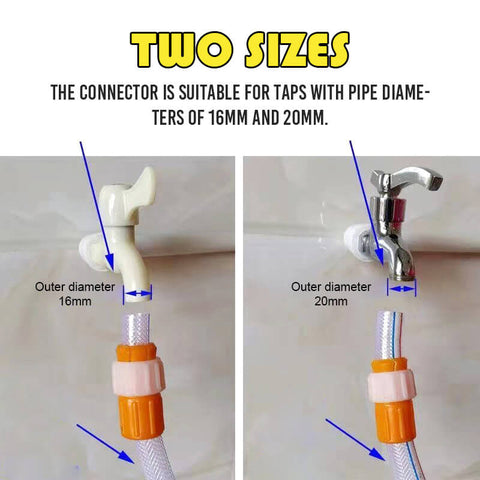 Диаметры 16 мм и 20 мм.Подходит для большинства типов соединительных шлангов, смесителей, устройств для полива и моек высокого давления.