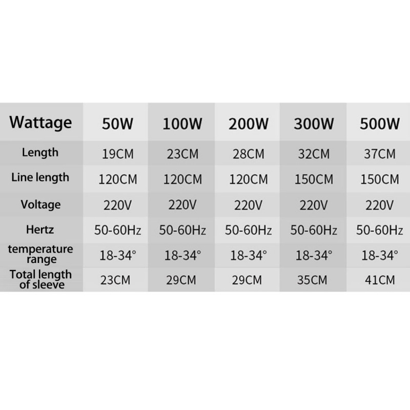 50 Вт: длина 19 см/", длина провода 120 см/", напряжение 220 В, Гц 50-60 Гц, диапазон регулирования температуры: 18-34 ℃