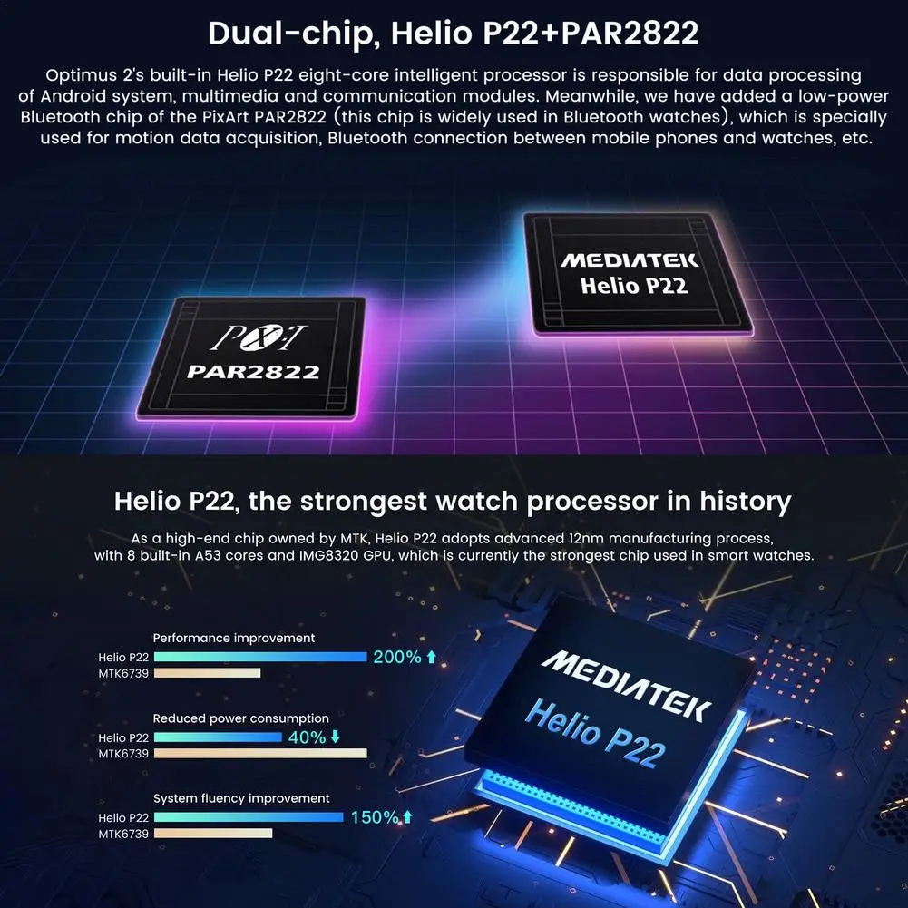 1. Двойной чип, для Helium P22 + PAR2822: Встроенный Восьмиядерный Интеллектуальный процессор для Helium p22 этих часов отвечает за обработку данных системы для Android, мультимедийные и коммуникационные модули. Кроме того, мы добавили низкомощный чип для PixArt PAR2822 (этот чип широко используется в беспроводных часах), который специально используется для сбора данных о движении, подключения между телефонами и часами, И т. д.Из-за ручного измерения возможны отклонения в размере изделия.