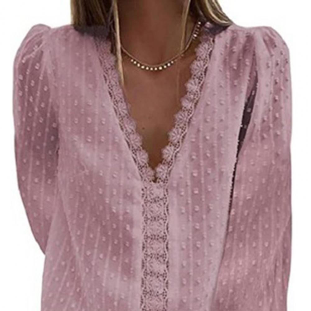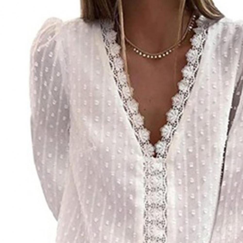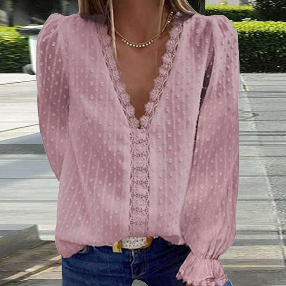 Элегантные блузки, Офисная Женская рубашка, кружевная Лоскутная блуза с v-образным вырезом, Женская однотонная шифоновая блузка с длинным рукавом, уличная одежда, топы, шикарные модные