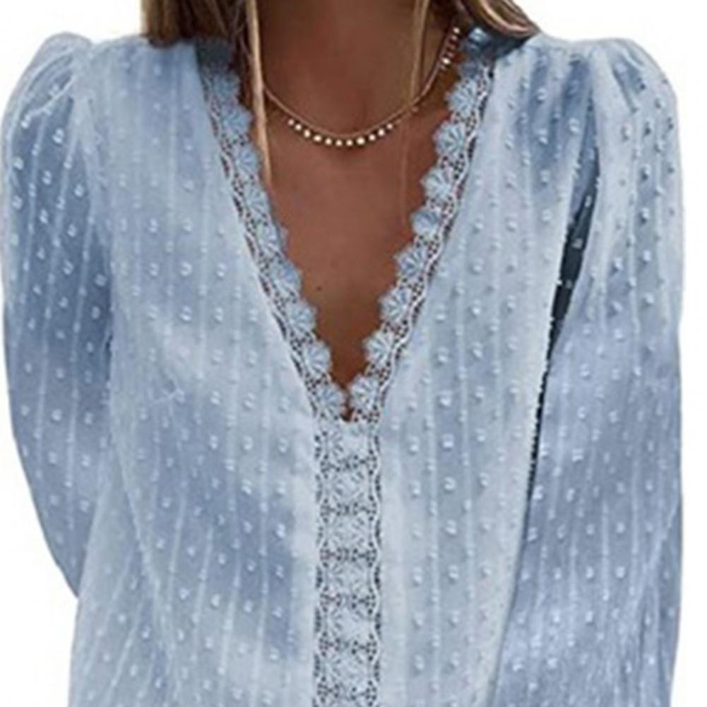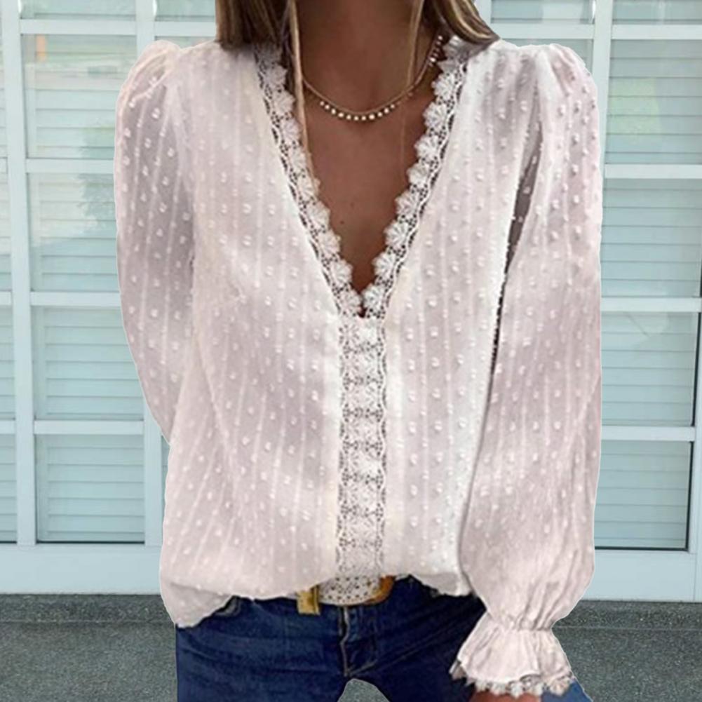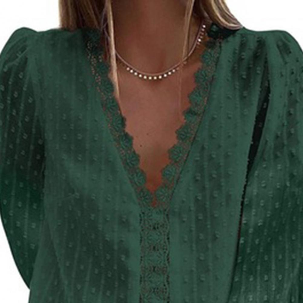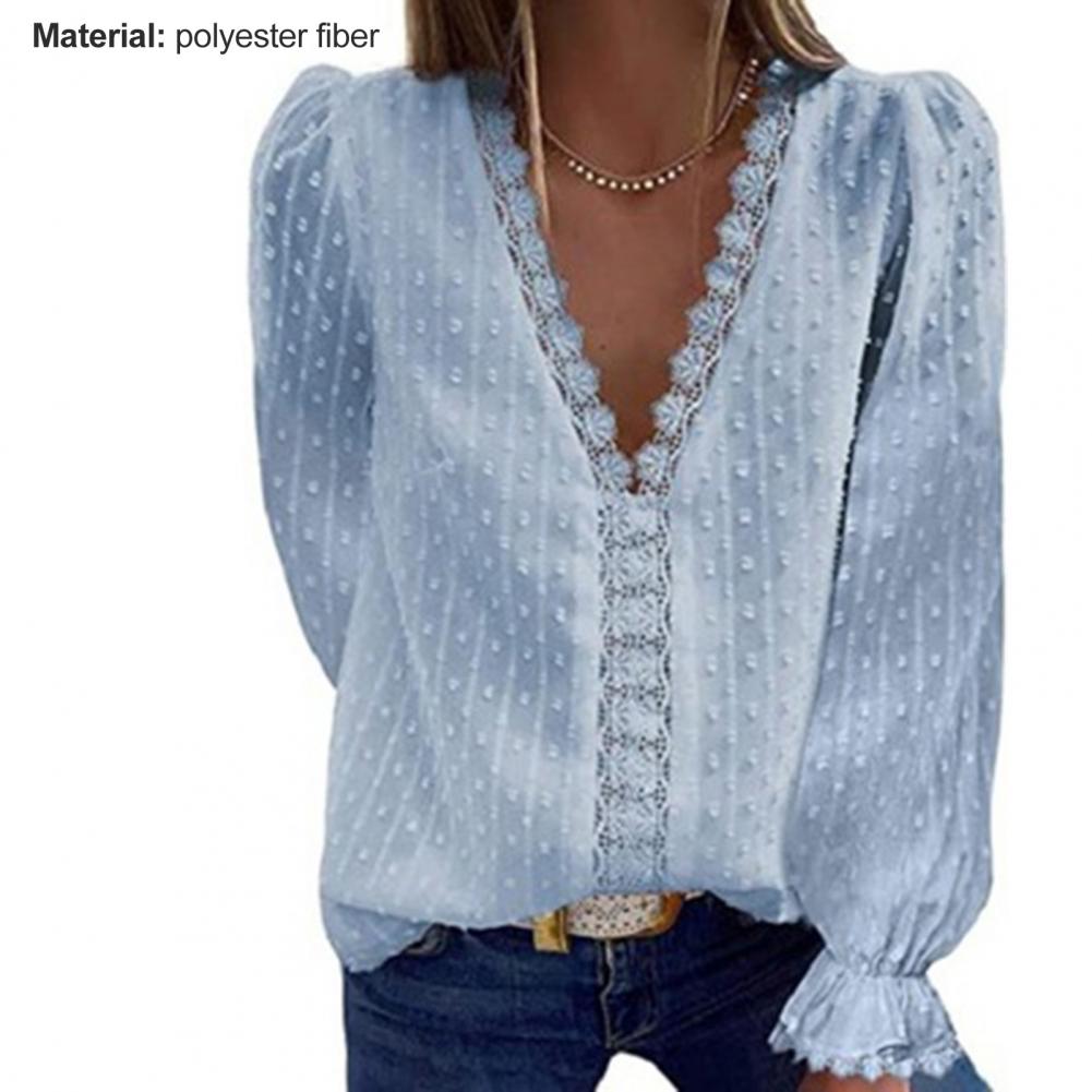 Элегантные блузки, Офисная Женская рубашка, кружевная Лоскутная блуза с v-образным вырезом, Женская однотонная шифоновая блузка с длинным рукавом, уличная одежда, топы, шикарные модные