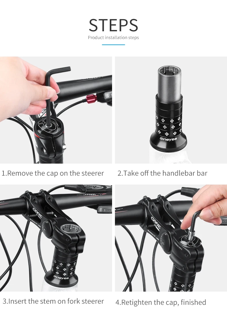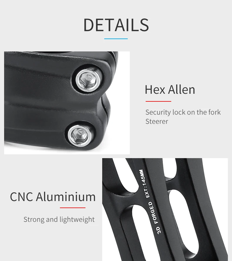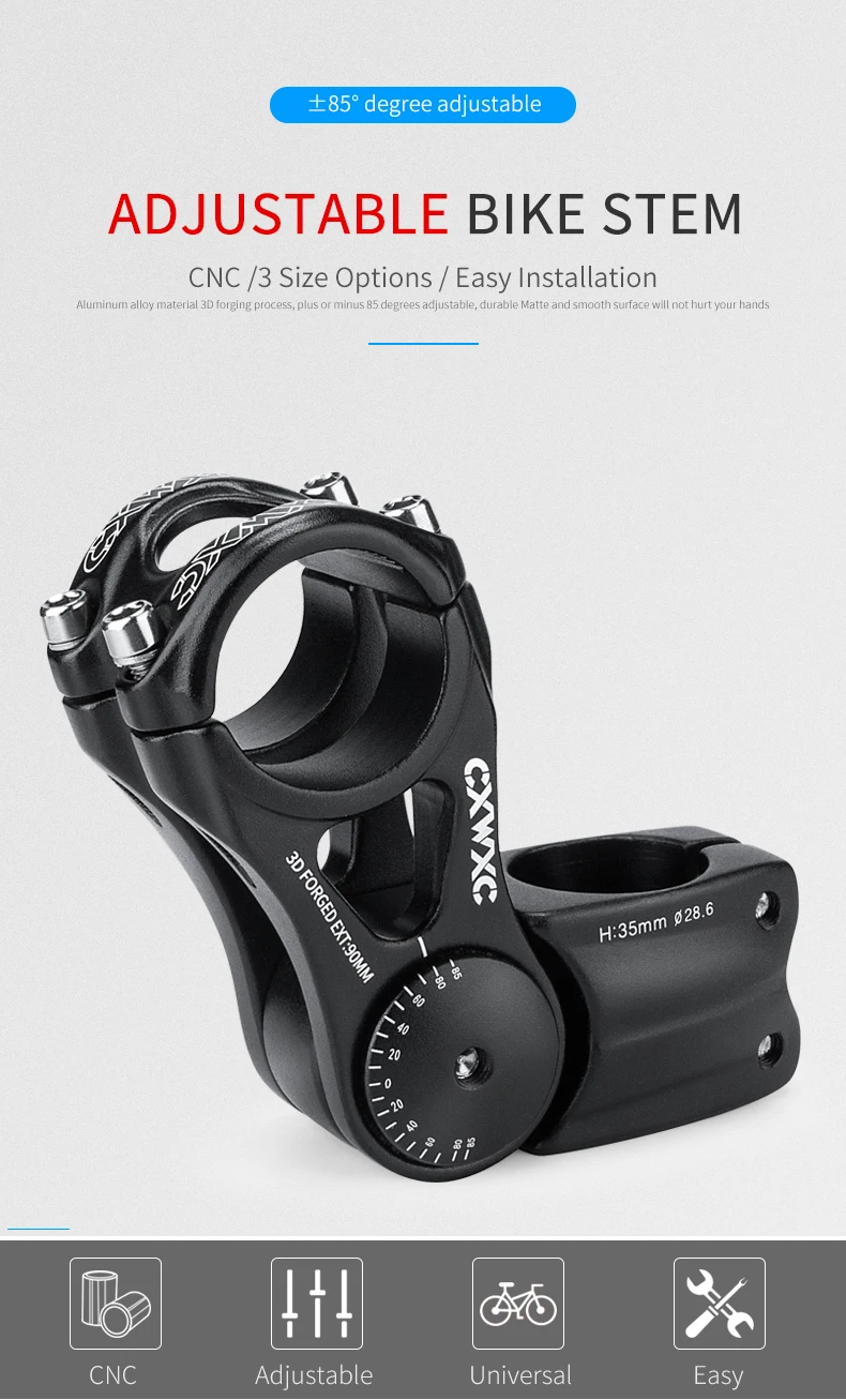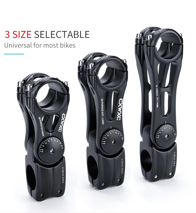* Диаметр центра руля: 31,8 мм (1-1/4 ")* Диаметр стереоскопической трубки: 28,6 мм (1-1/8 ")* Степень: 0-85 ° градусов (регулируемая)* Длина: 90 мм/110 мм/145 мм* Вес: 265 / 293 / 316 г* Стиль: стержень высокой интенсивности* Материал: алюминий Slloy AL6061 T6 ** Полый дизайн делает светильник весовым.** Изготовлен из высокопрочного алюминиевого сплава.** Подходит для большинства шоссейных велосипедов, горных велосипедов, складных велосипедов, трековых велосипедов, MTB, BMX, DH и т. д.** Простая установка, просто подключите оригинальный стержень передней вилки. Четыре болта зажим надежно удерживает бар в положении.** Отрегулируйте угол, от 0 градусов до 85 градусов. Поклонники горного велосипеда знают, какая разница. Вы можете установить его для быстрой обработки и отзывчивости, или педалей для крутых подъемов.Витрина