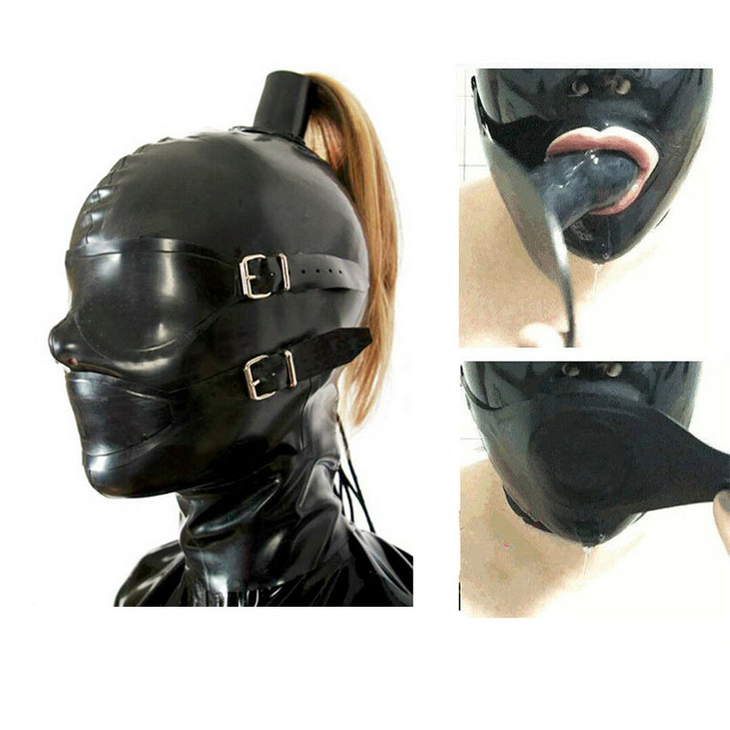Черная латексная маска резиновый капюшон с полой оплеткой туба может блонд парик чешуя глаза крышка и Кляпы для рта с задней молнией настроить