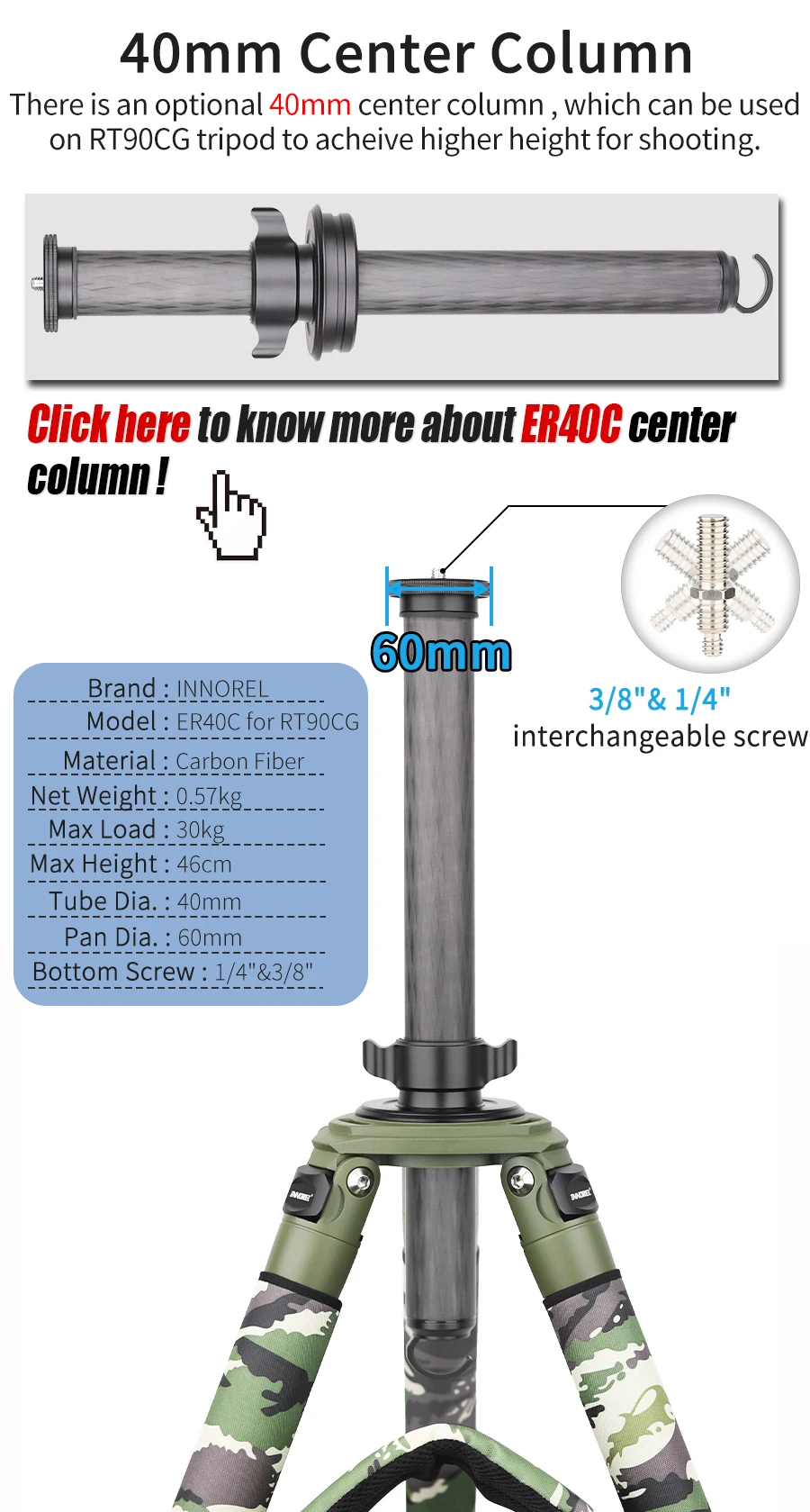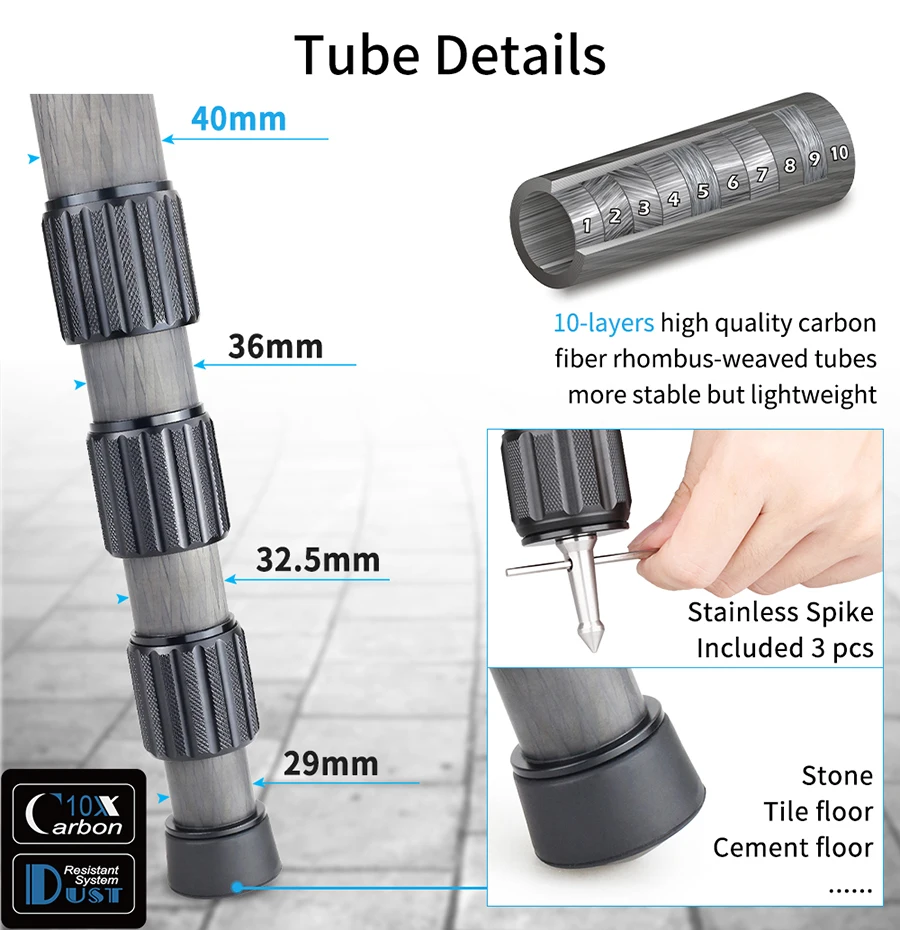 【Отличная трубка】Его максимальный диаметр ножки составляет 40 мм, а минимальный составляет 29 мм, что намного больше, чем большинство штативов, изготовлен из подлинного 10-слойного углеродного волокна для максимальной прочности ножек и соотношения веса штатива RT90CG/LT404CG, максимальная нагрузка до 40 кг.