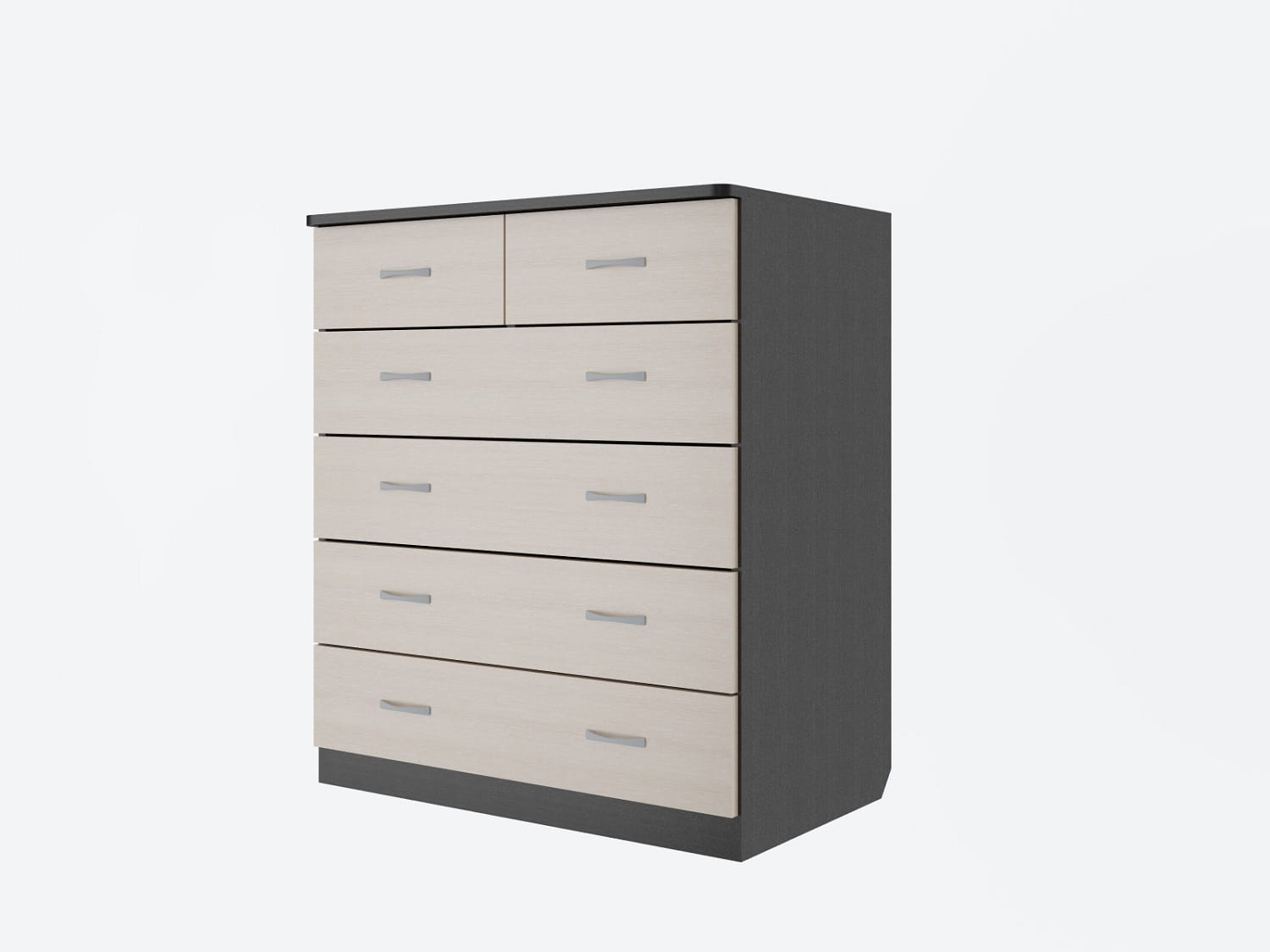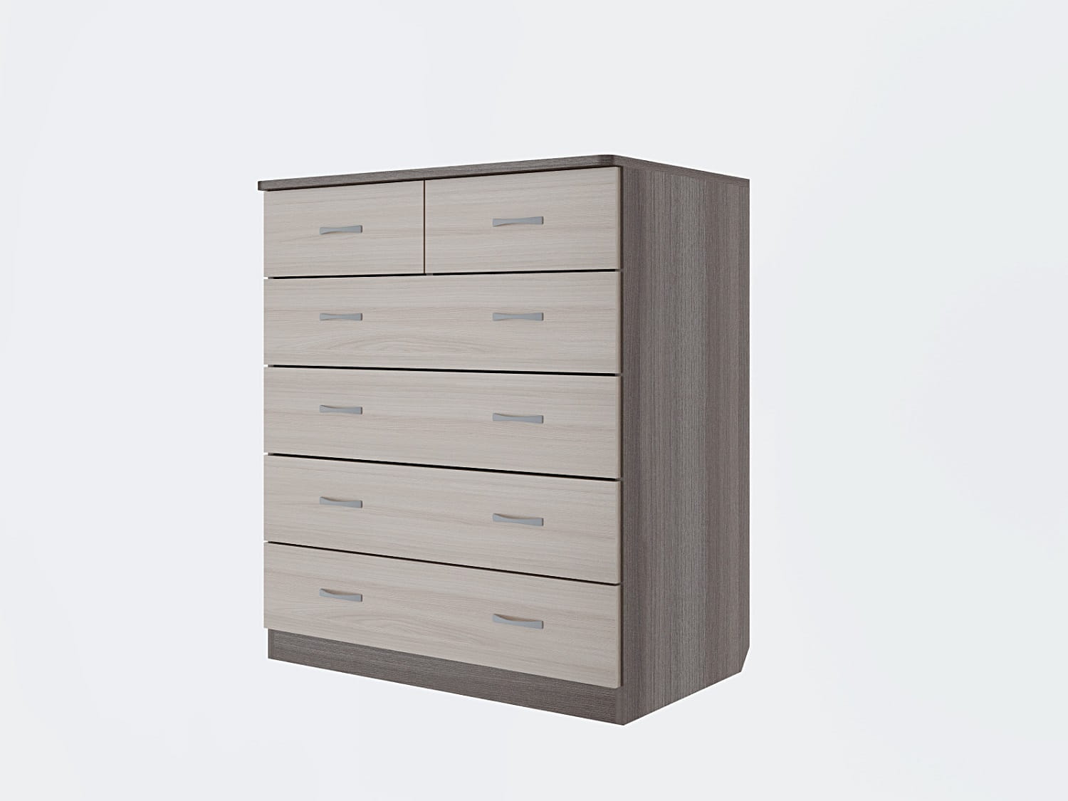 Классический комод с 4 глубокими и 2 малыми ящиками. Каркас и фасады ЛДСП 16 мм. Кромка изготовлена из экологичного материала АБС и Т-образного декорированного канта. В комплектацию входят металлические ручки (10 шт).Товар под заказ.