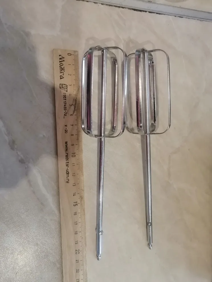 Венчики хорошие, пришли раньше, чем ожидалось, в характеристиках длина была 17,5 см, по факту 21 см, подошли на миксер polaris PHM 3009A. К HYUNDAY HYM H 4301 не подошли, надо более узкие у основания.