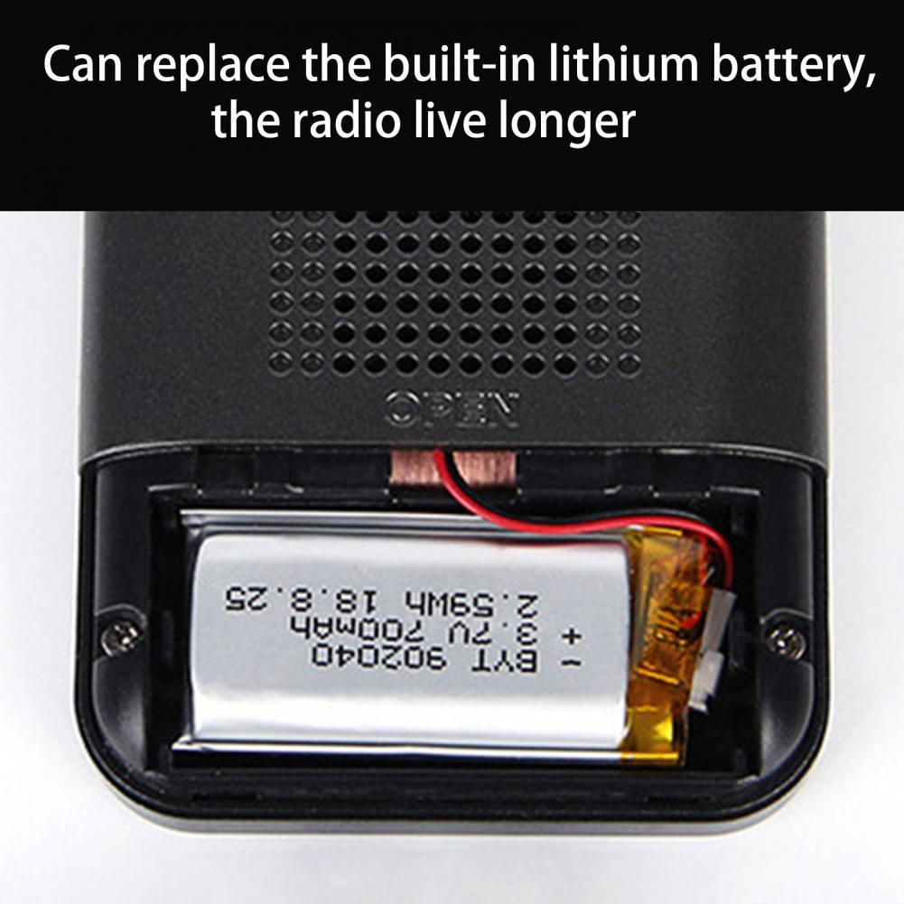 Встроенный аккумулятор емкостью 700 мАч, это радио, которое имеет длительное время работы в режиме ожидания. Выдвижная антенна и удлиненная антенна могут эффективно принимать входящие сигналы.