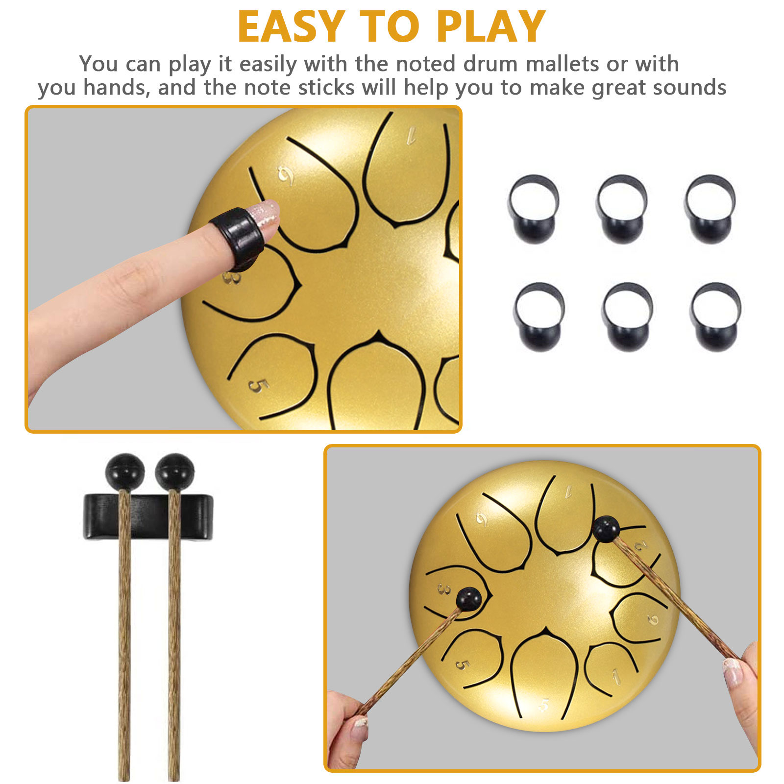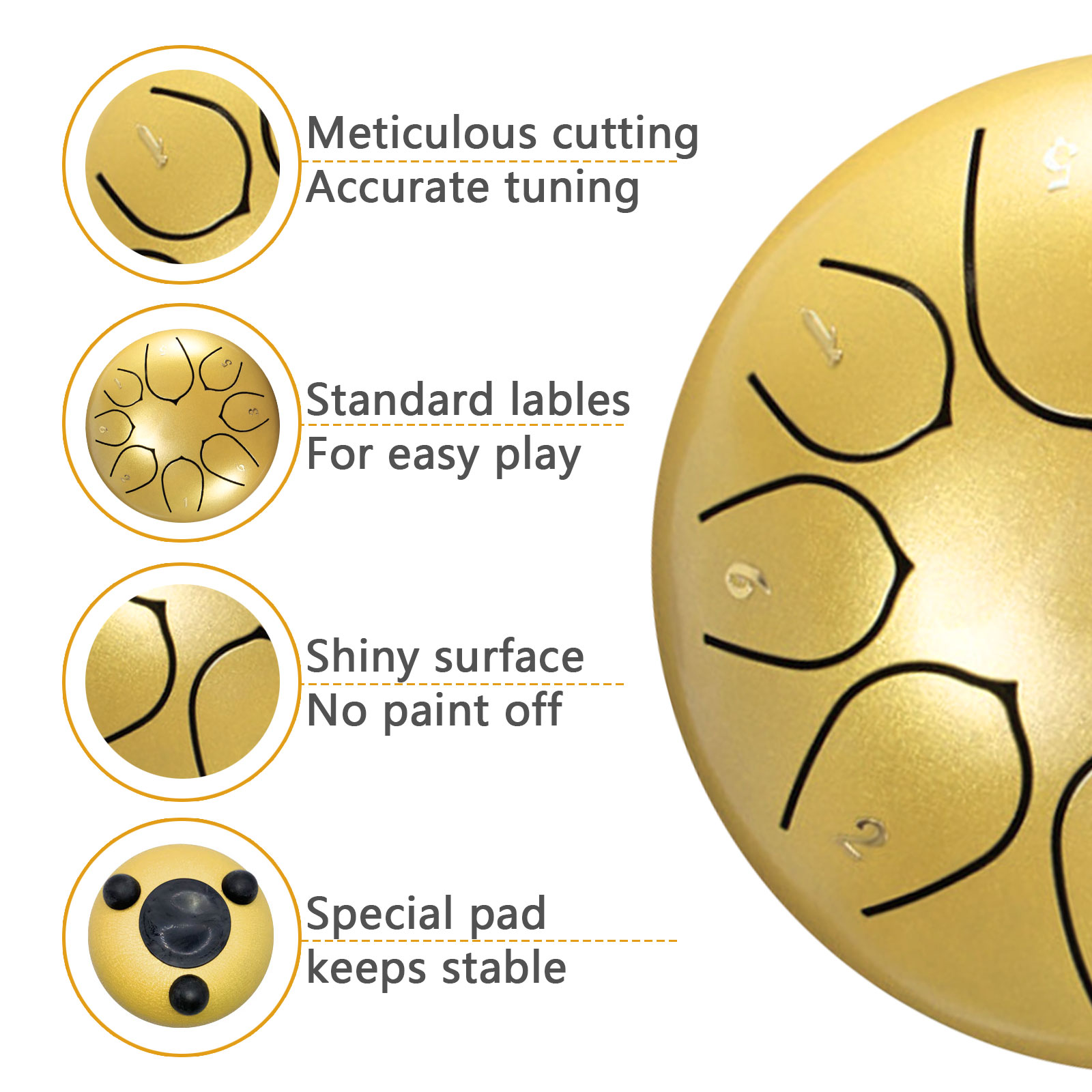Стальной барабан имеет широкий диапазон звука, может издавать 6 видов звуков, вы можете играть с молотками или пальцами.