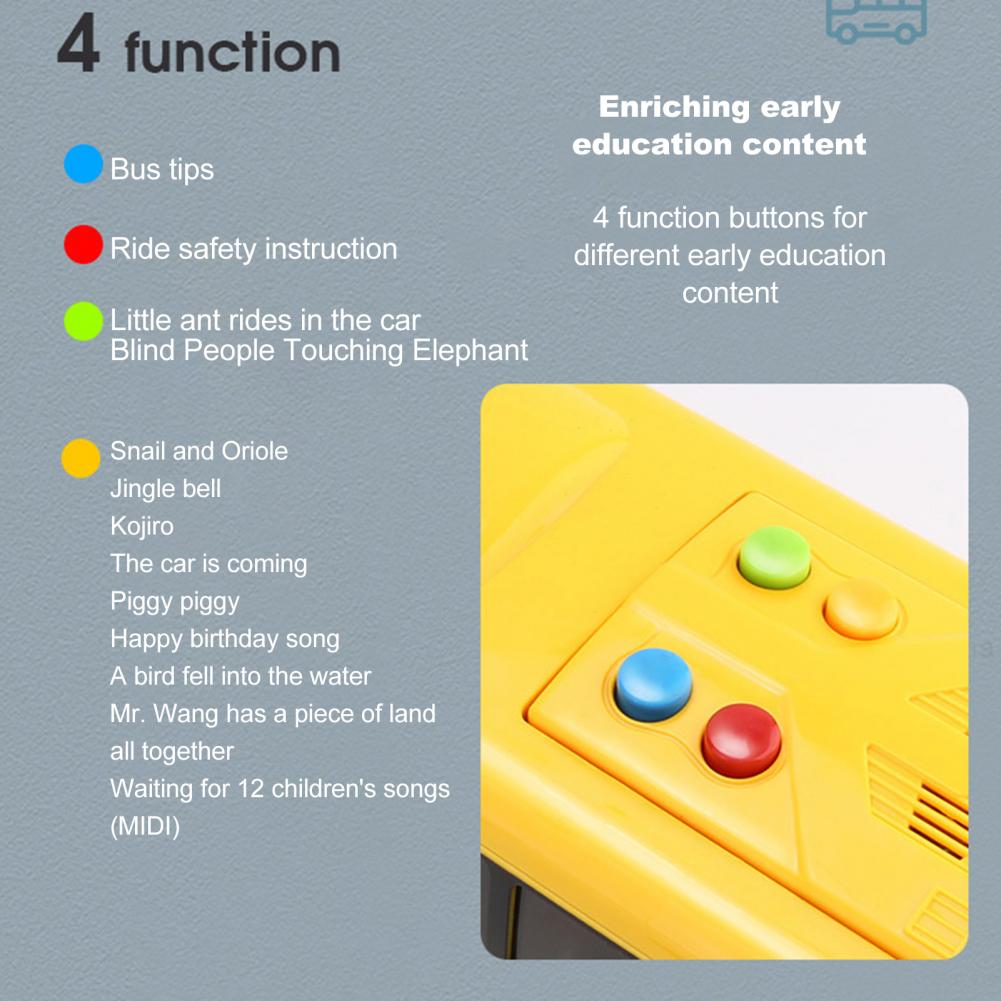 Стиль A: богатое содержание раннего образования. 8 раз звук животных (нажатие головки автобуса в течение 1 раз), 8 видов звуков транспорта (нажатие головки автобуса в 2 раза), ощущение движения (нажатие головки автобуса в 3 раза), 4 детских песни (нажатие головки автобуса 4 раза), с открывающимися дверцами.