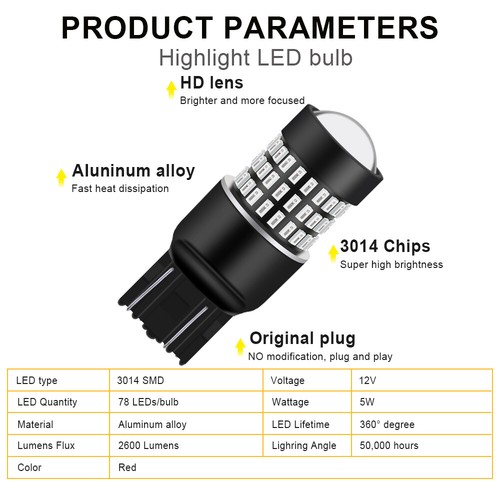 Параметр:Модель: 7443 T20 7444A T20 990 992 991 7443RЦветовая температура: красныйСветодиодный чип: 78 шт. 3014-SMD светодиодный чипУровень водонепроницаемости: IP65 водонепроницаемый и ударопрочныйМощность: 4 Вт/на лампу, 8 Вт/на комплектТип луча: угол луча 360 °Сертифицировано CE & ROHsРабочее напряжение: 12 В постоянного токаГарантия: 1 годСрок службы: более 60000 часов